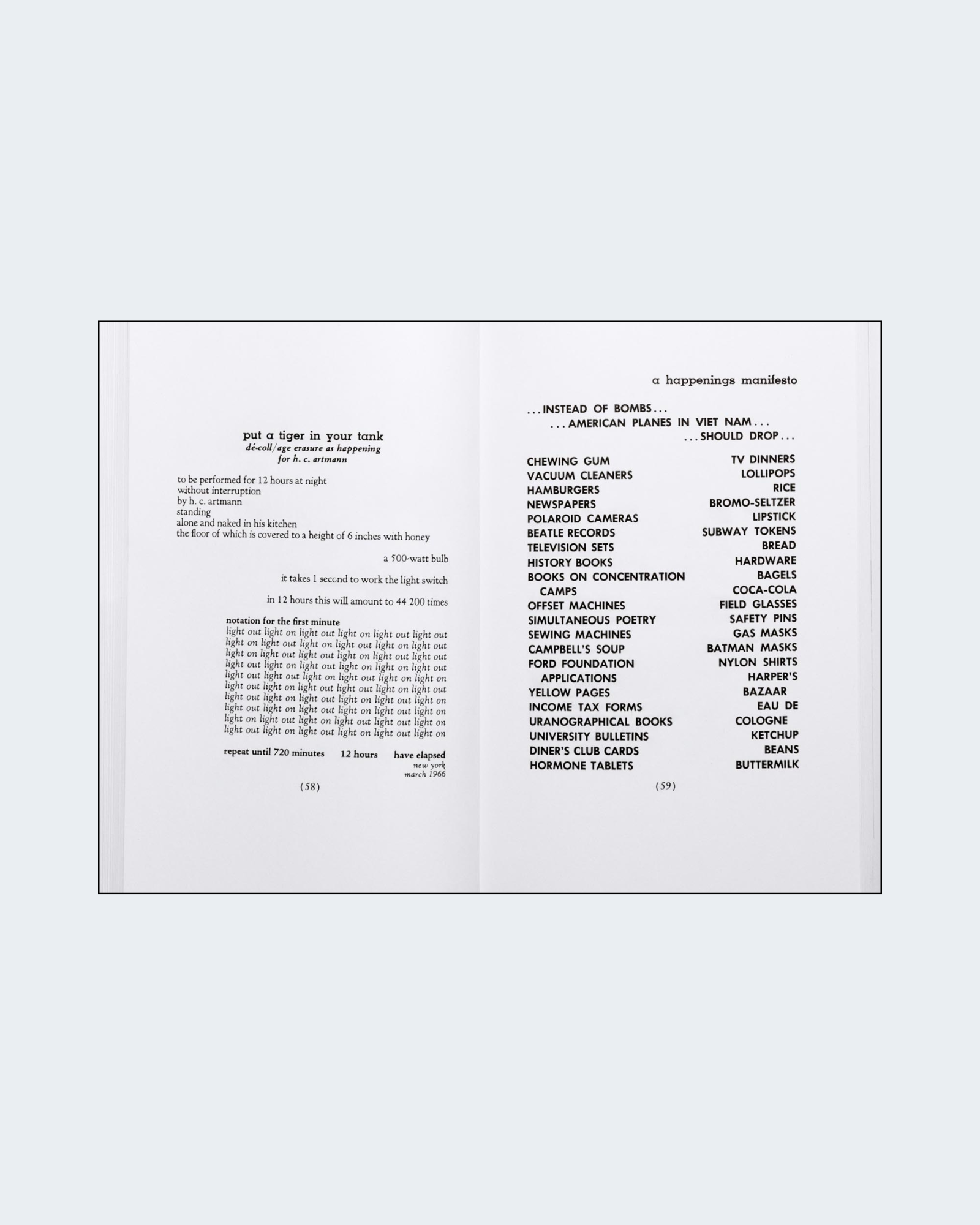 The publication features selections from Claes Oldenburg’s Store Days, John Cage’s Notations, An Anthology of Concrete Poetry, Breakthrough Fictioneers, Jackson Mac Low’s Stanzas for Iris Lezak, Gertrude Stein’s Matisse Picasso and Gertrude Stein, Bern Porter’s I’ve Left, Wolf Vostell’s Dé-coll/age Happenings, Al Hansen’s A Primer of Happenings & Time/Space Art, and other projects for the page by Robert Filliou, Alison Knowles, Nam June Paik, Philip Corner, Daniel Spoerri, André Thomkins, and Richard Meltzer, among others. An annotated checklist assembled by Hugh Fox and Higgins’s unpublished introduction are also included.