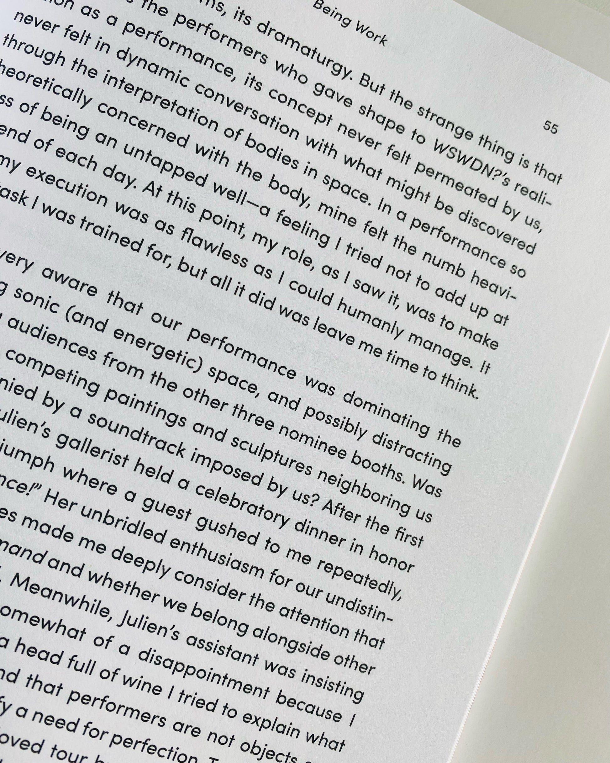 From the press: Being Work is a collection of essays by dance and theater artists that offer access to varied experiences of performing in live exhibitions. The authors capture a spectrum of mundane and profound moments that arise within performance gig work in visual arts contexts such as museums, galleries and art fairs, detailing the day-to-day practice of inhabiting art work as well as reflecting on broader questions of how they got there and the impact it has had on their outside lives. While providing very personal, human perspectives on what it feels like to perform in visual arts spaces, Being Work asks its audience how a performer’s labor is perceived and valued in these spaces, and what new possibilities might unfurl within the, at times fraught, coexistence of the two mediums.