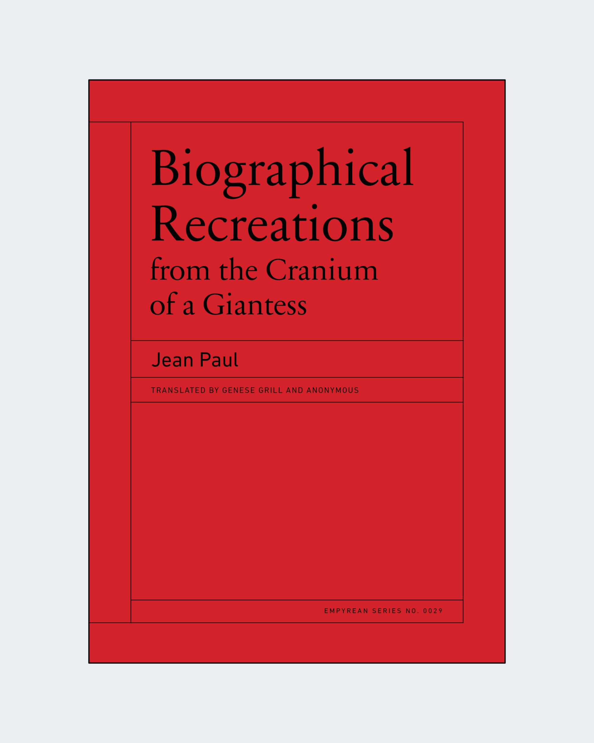 From the press: Narrated as the story’s author Jean Paul travels in a carriage about the German countryside and installs himself within the head of a colossal statue, this witty novel combines gothic-horror elements with the love story of Count Lismore and his beloved Adeline in the time of the French Revolution. Included are the book’s “satirical appendix”, a record of the courtroom proceedings in the case on behalf of the reader contra Jean Paul, concerning his narrative digressions; and the novella “The Obersee Parish Beer Fest, or the Vanity of Others’ and One’s Own Modesty”. Here is a multifarious, uncategorizable volume that showcases Jean Paul in all of his freewheeling, erudite originality. The edition includes a translator's note from Genese Grill, and a note on the text from Empyrean series co-editor Jacob Siefring.
