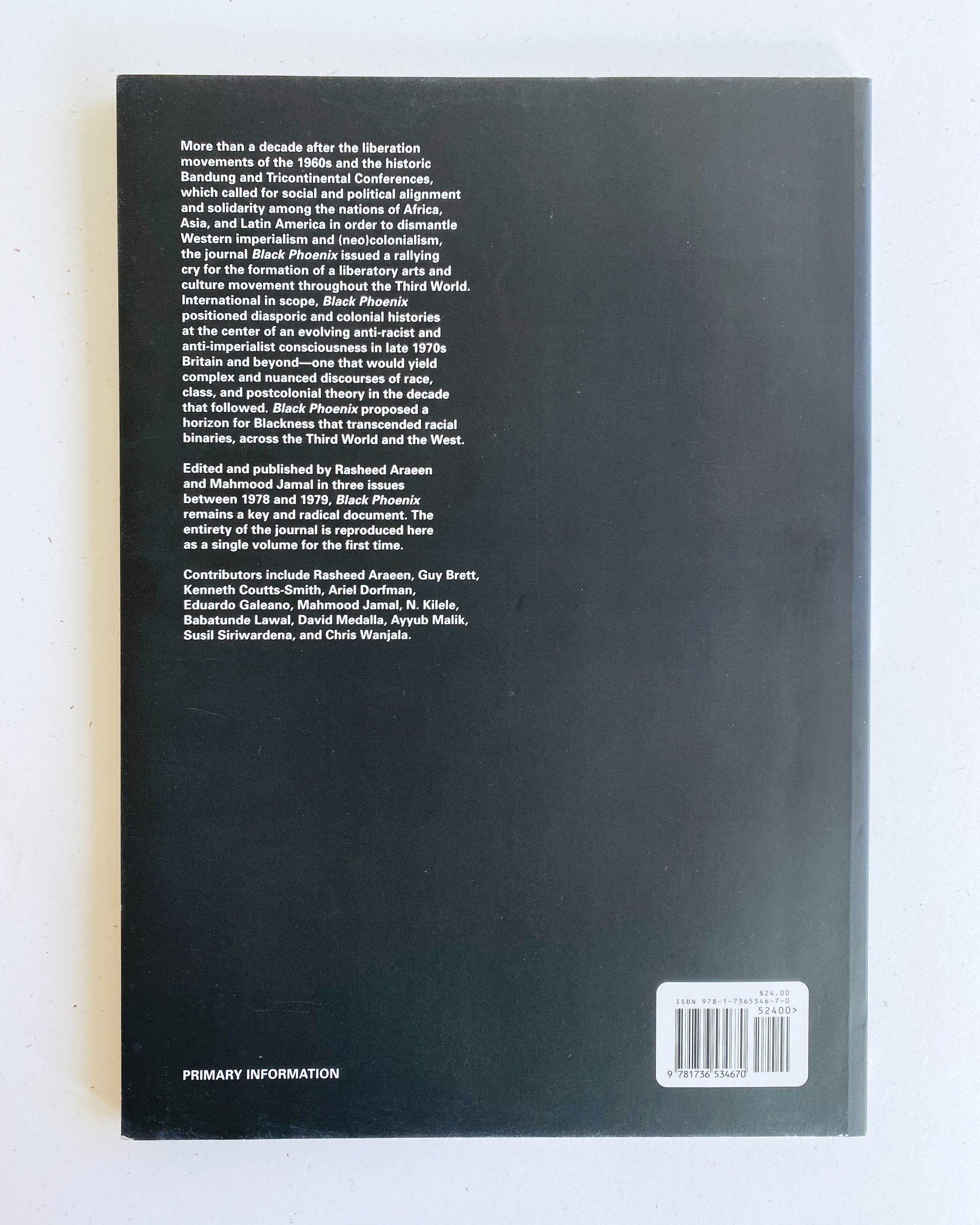 From the press: This publication is a compilation of all three issues of the journal Black Phoenix published as a single volume. Edited and published by Rasheed Araeen and Mahmood Jamal between 1978 and 1979 in the United Kingdom, Black Phoenix remains a key and radical document of transnational solidarity and cultural production in the visual arts, literature, activism, and beyond.