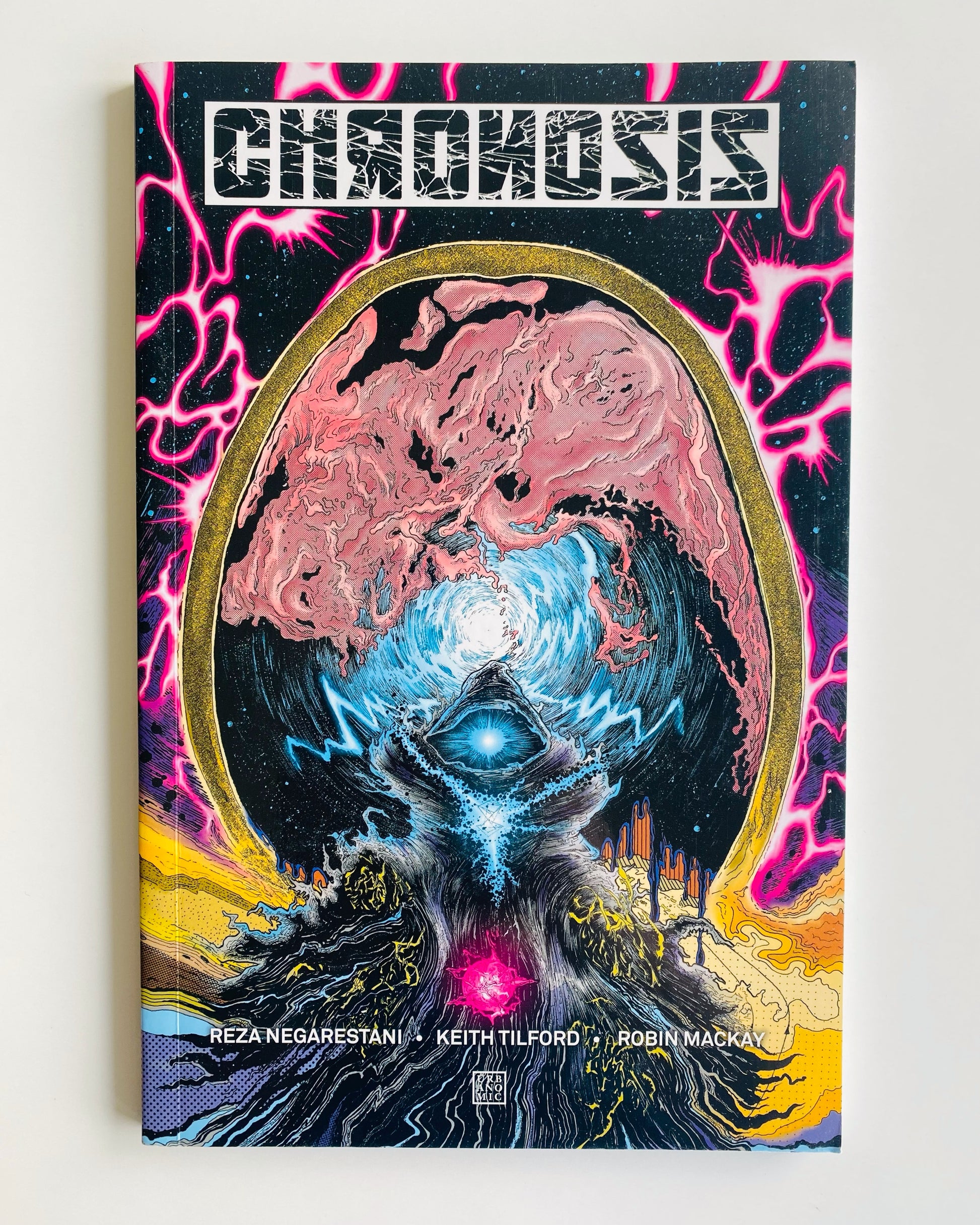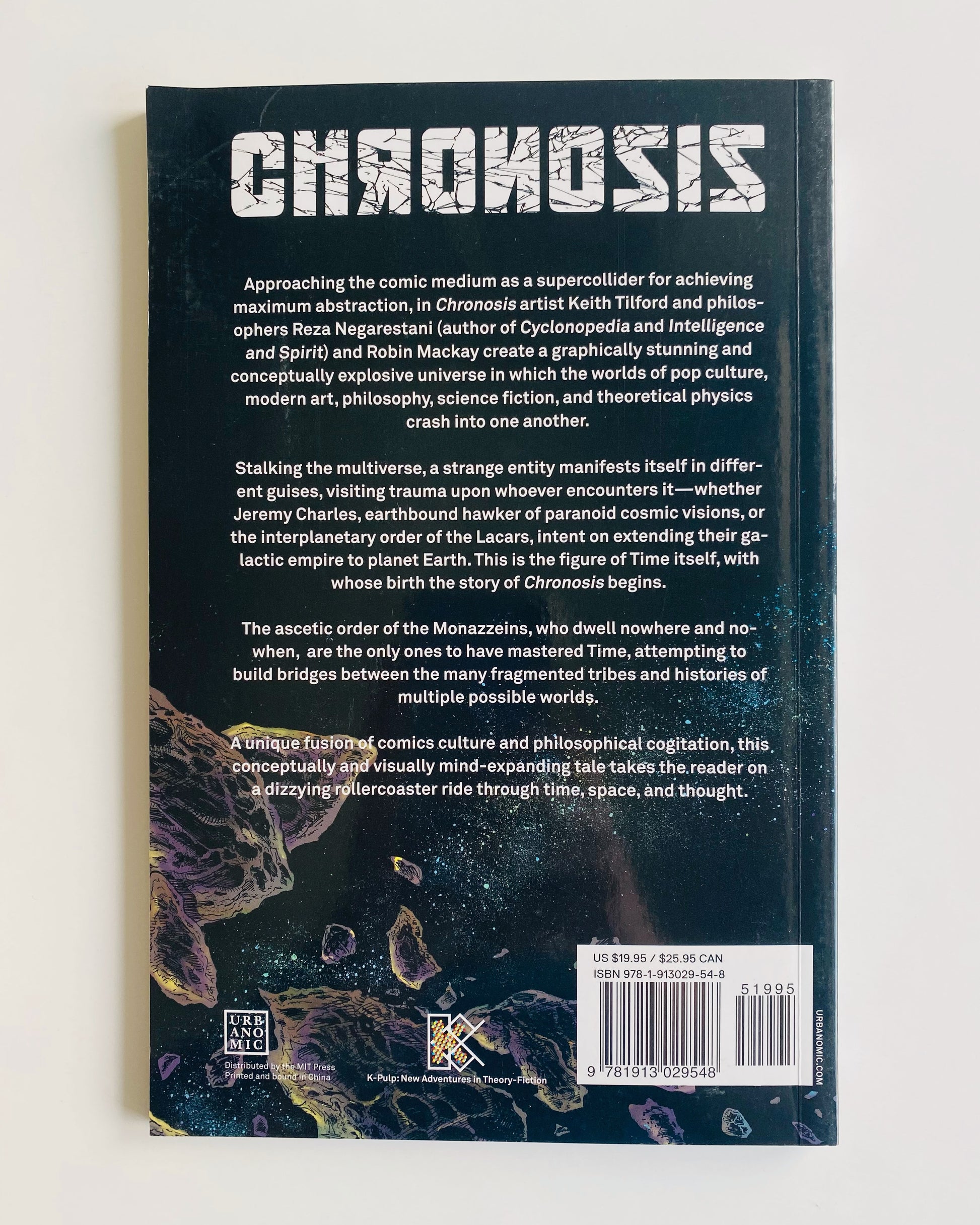 Approaching the comic medium as a supercollider for achieving maximum abstraction, in Chronosis artist Keith Tilford and philosopher Reza Negarestani create a graphically stunning and conceptually explosive universe in which the worlds of pop culture, modern art, philosophy, science fiction, and theoretical physics crash into one another.