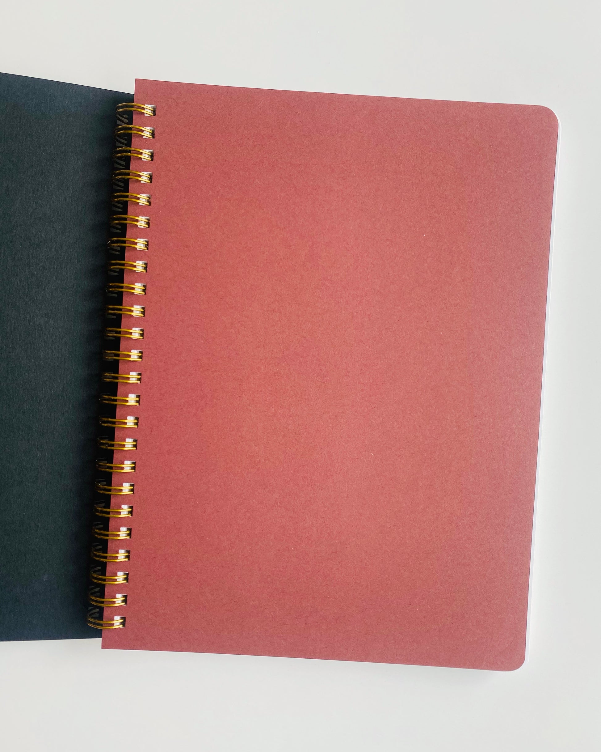 These coil bound notebooks, printed and assembled by hand, are the perfect combination of rugged, practical, and good-looking. Their large format means they’re great for writing and drawing while sturdy covers, rounded corners, and a brass coil binding protect your pages on the go. Covers are screen printed by hand and all notebooks feature contrasting endpapers.