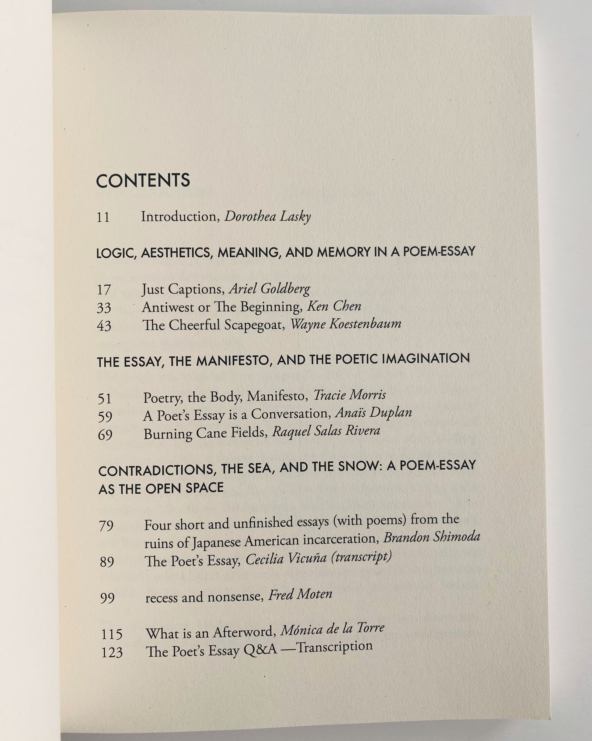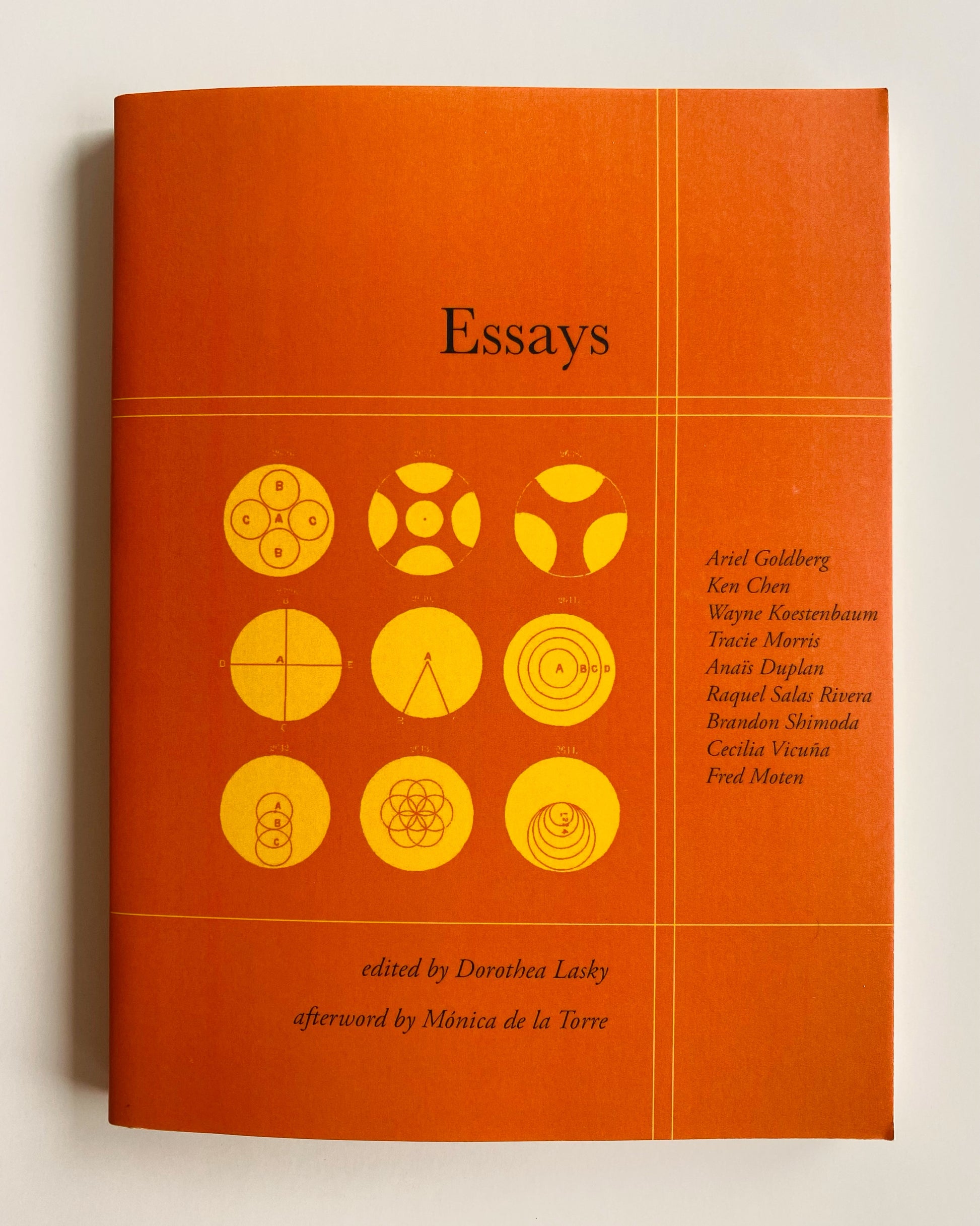 ESSAYS, edited by Dorothea Lasky, is a book of essays on the essay, which enact and query these directives. The volume collects essays by poets Ariel Goldberg, Ken Chen, Wayne Koestenbaum, Tracie Morris, Anaïs Duplan, Raquel Salas Rivera, Brandon Shimoda, Cecilia Vicuña, Fred Moten, and Mónica de la Torre.