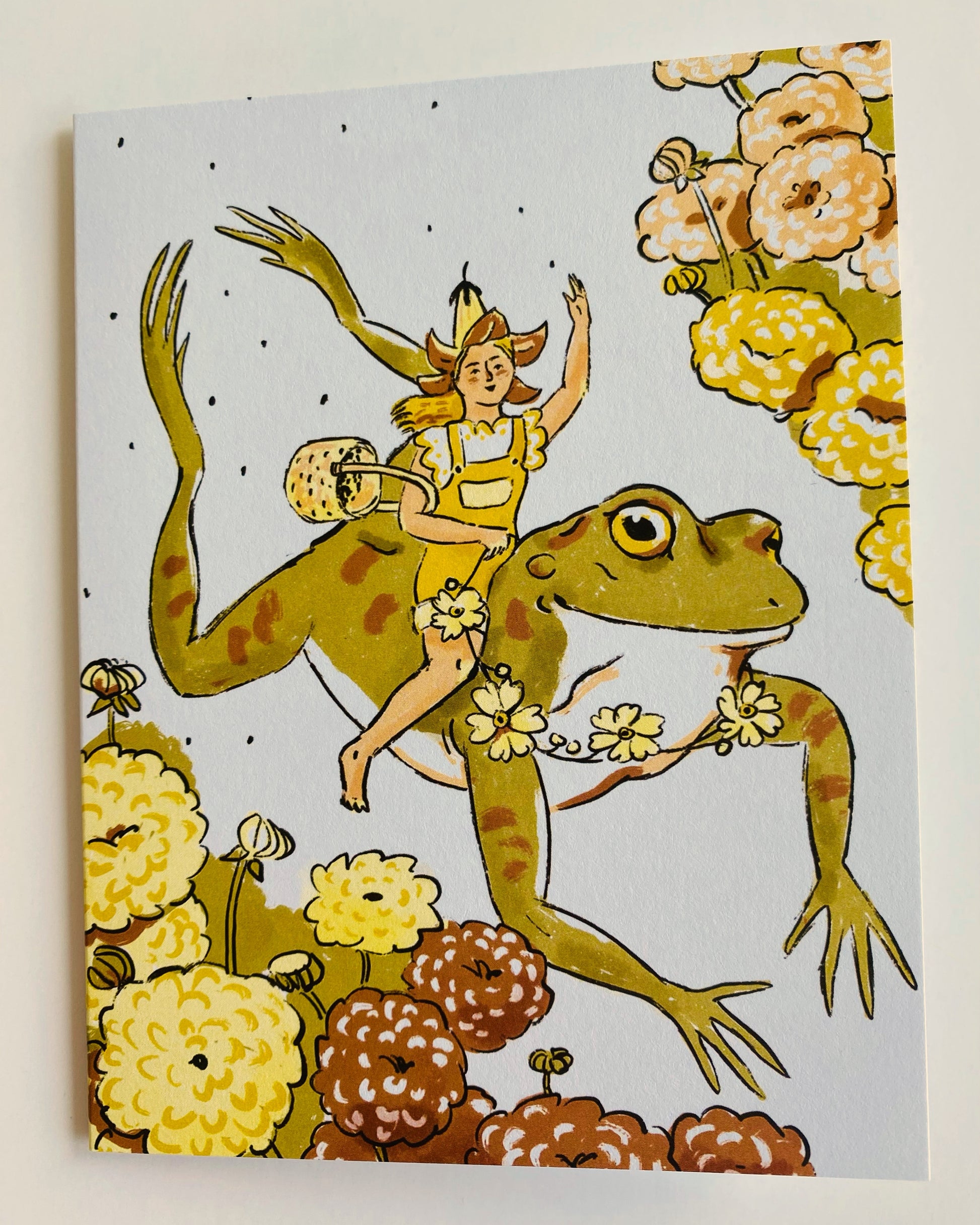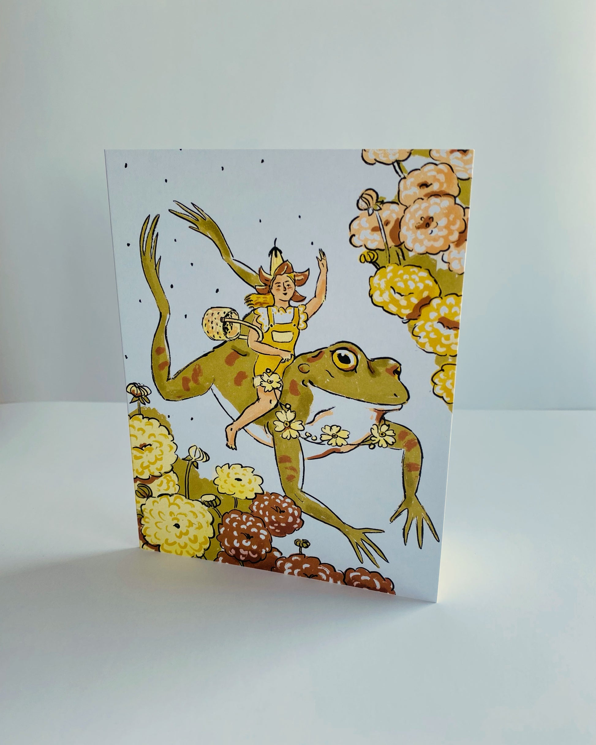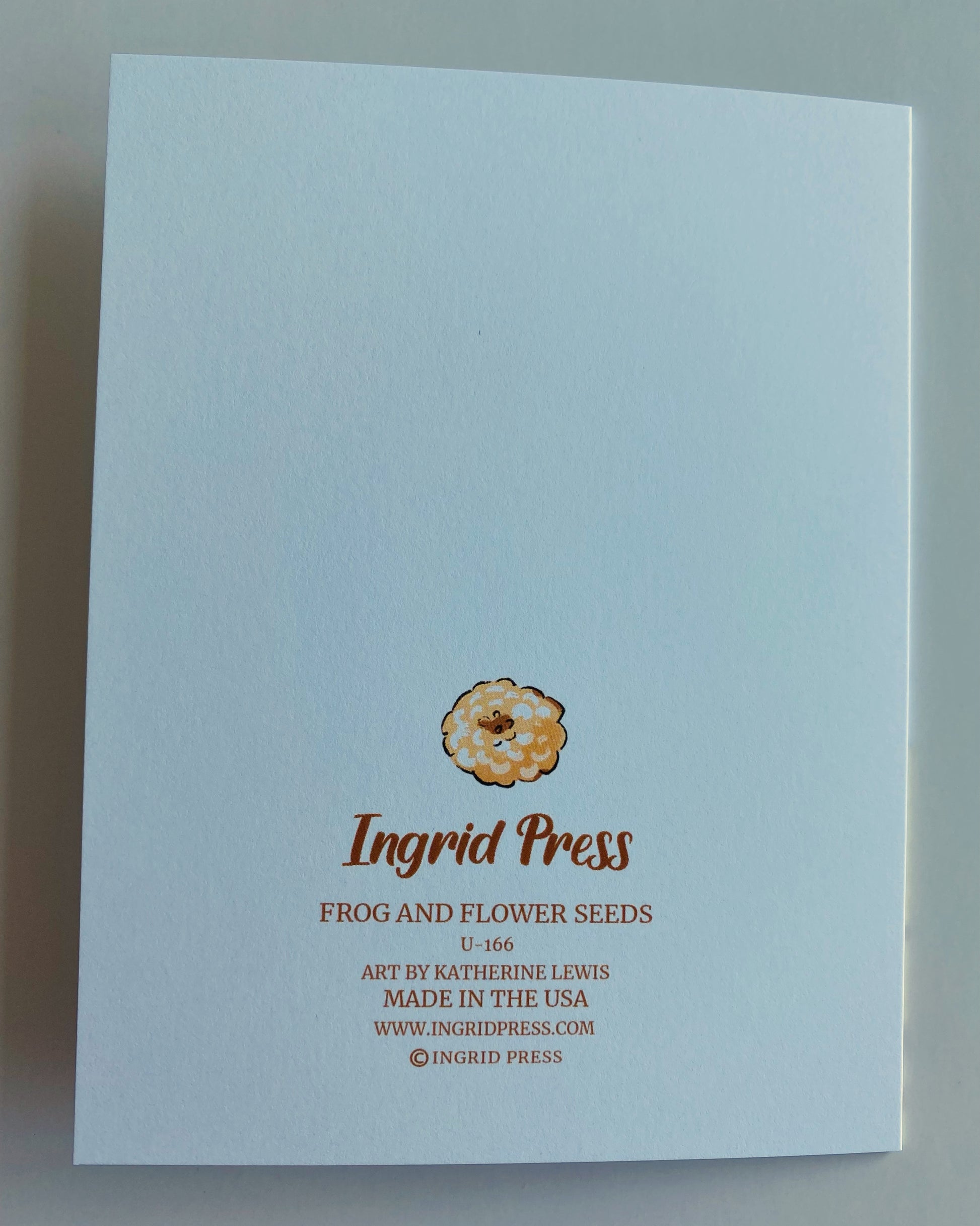 Ingrid Press, art by Katherine Lewis. Printed on un-coated white stock, white envelope. Blank inside. Size A2 4.25” x 5.5”