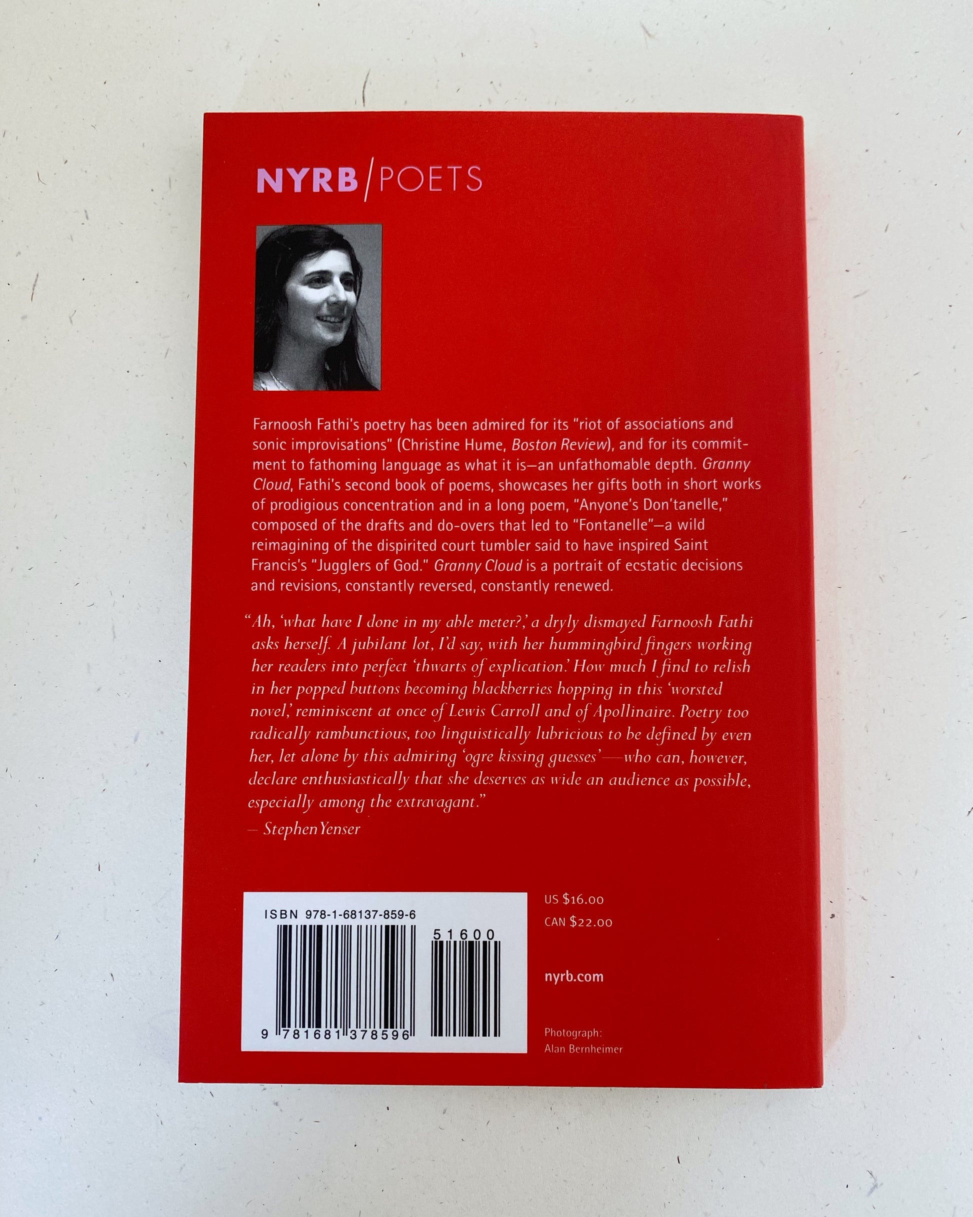 From the press: Farnoosh Fathi’s poetry has been admired for its “riot of associations and sonic improvisations” (Christine Hume, Boston Review); its commitment to fathoming language as what it is—an unfathomable depth. Granny Cloud, Fathi’s second book of poems, showcases her gifts both in short works of prodigious concentration and in a long poem, “Anyone’s Don’tanelle,” composed of the drafts and do-overs that led to “Fontanelle”—a wild reimagining of the dispirited court tumbler said to have inspired St. Francis’s “Jugglers of God.” Granny Cloud is a portrait of ecstatic decisions and revisions, constantly reversed, constantly renewed.