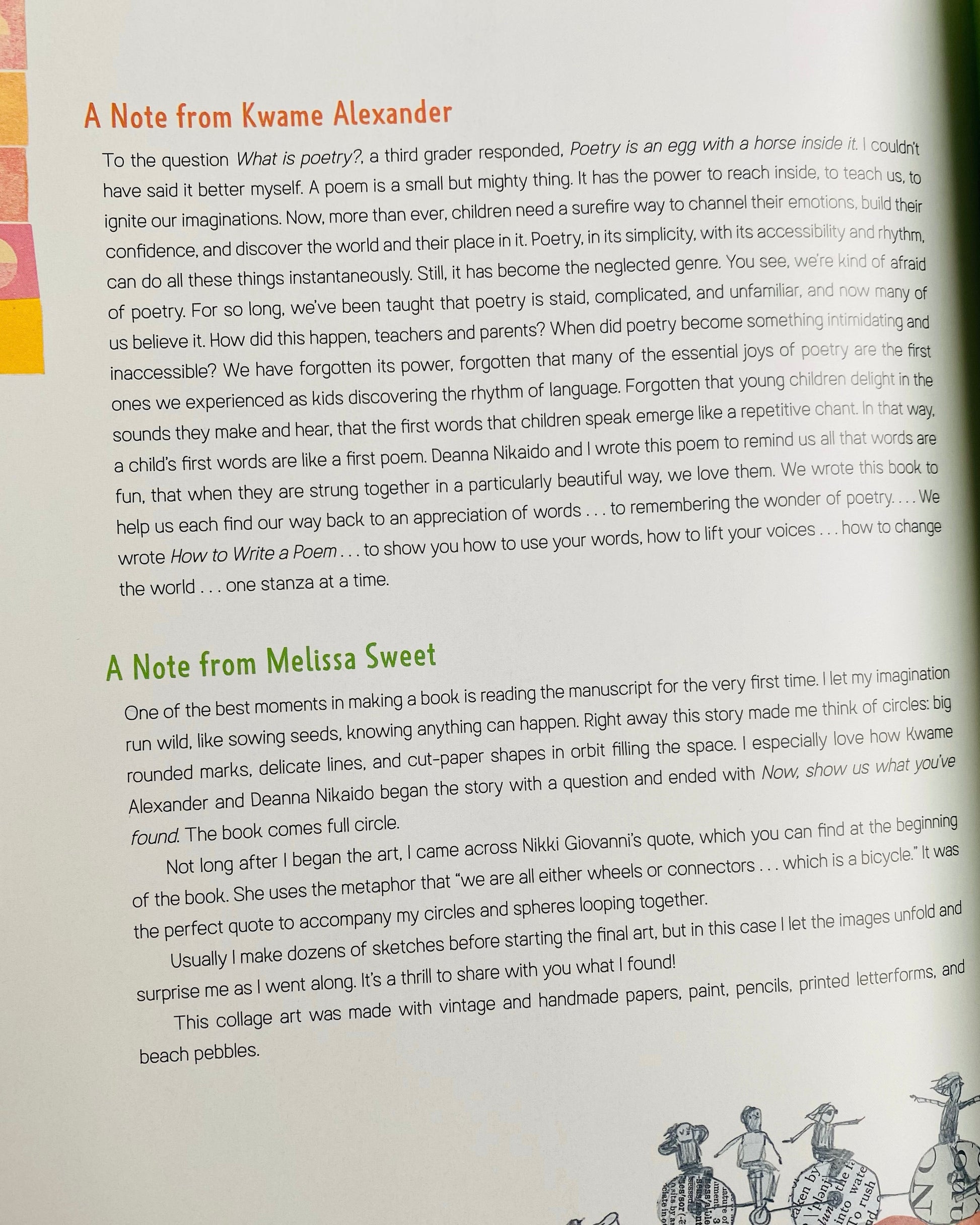 From this first stanza, readers are invited to pay attention—and to see that paying attention itself is poetry. Kwame Alexander and Deanna Nikaido's playful text and Melissa Sweet's dynamic, inventive artwork are paired together to encourage readers to listen, feel, and discover the words that dance in the world around them—poems just waiting to be written down.