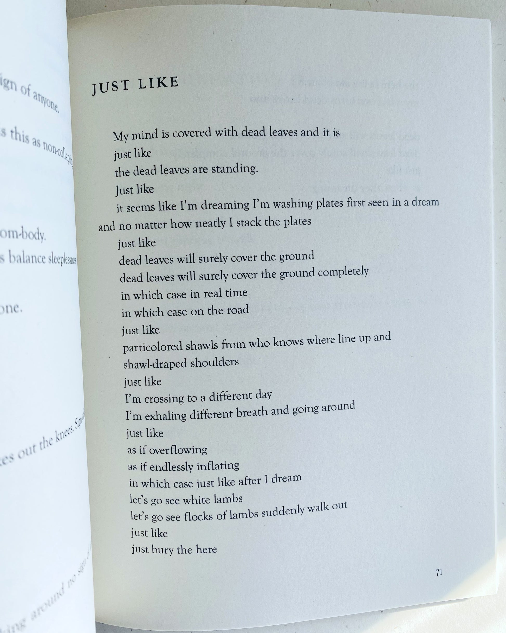 The poems of Lee Sumyeong's Just Like evince a striking tension between clarity and complexity. Purged of any heightened diction or preciously wrought syntax, Lee's writing can give the impression of being austere to the point of crystallinity. But it is the opposite-a teeming space where concrete objects become unstable and where simple propositions constantly buckle and fissure.