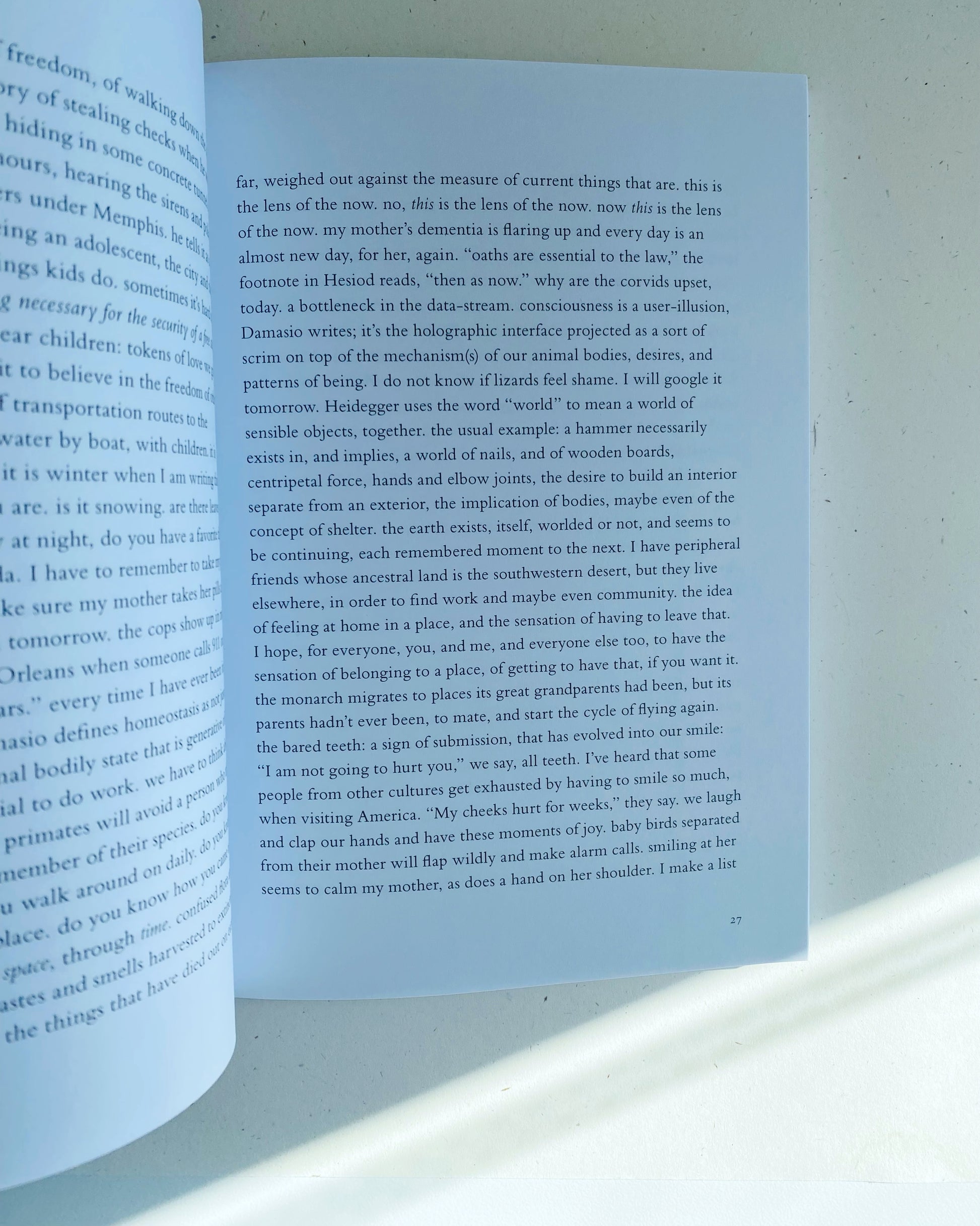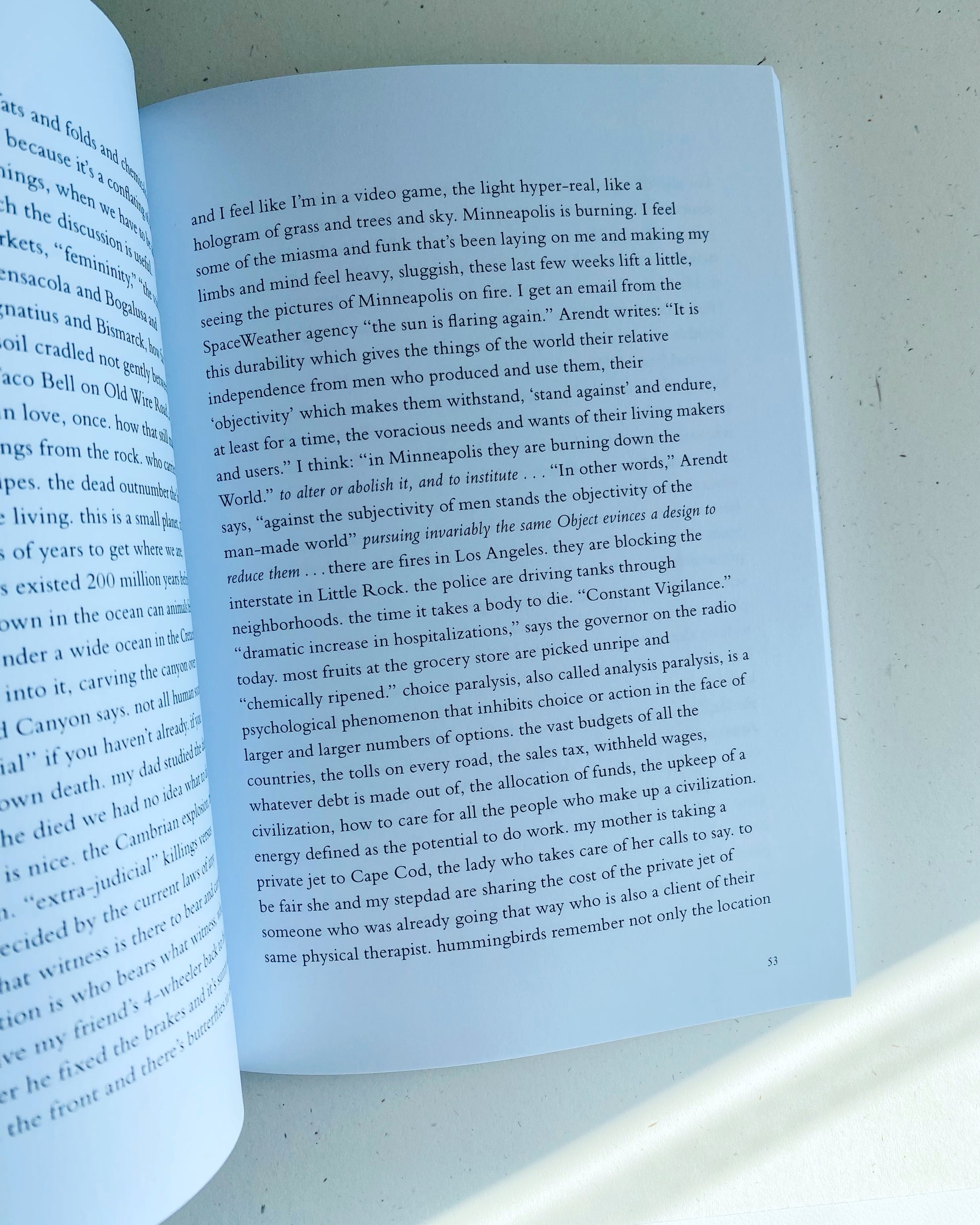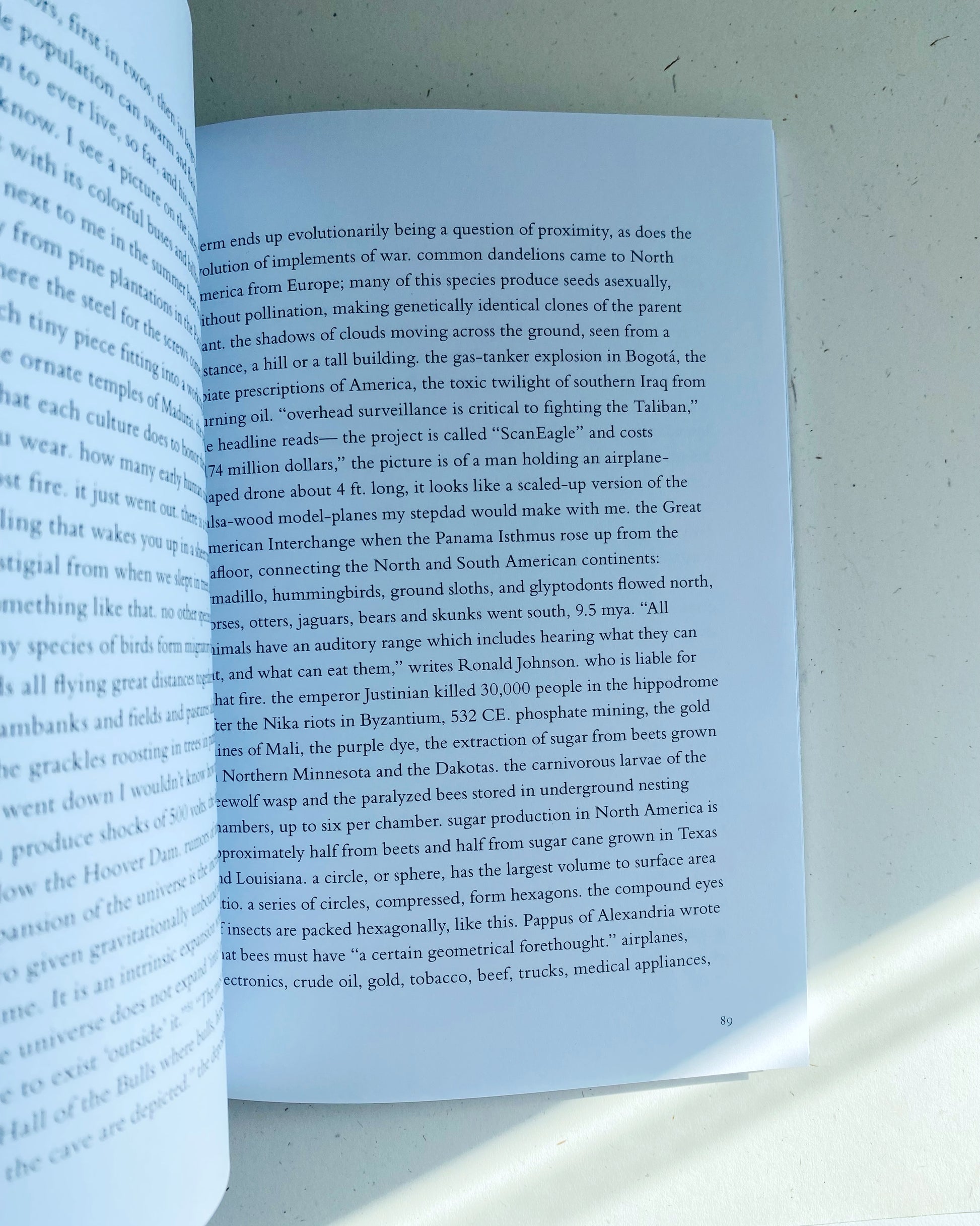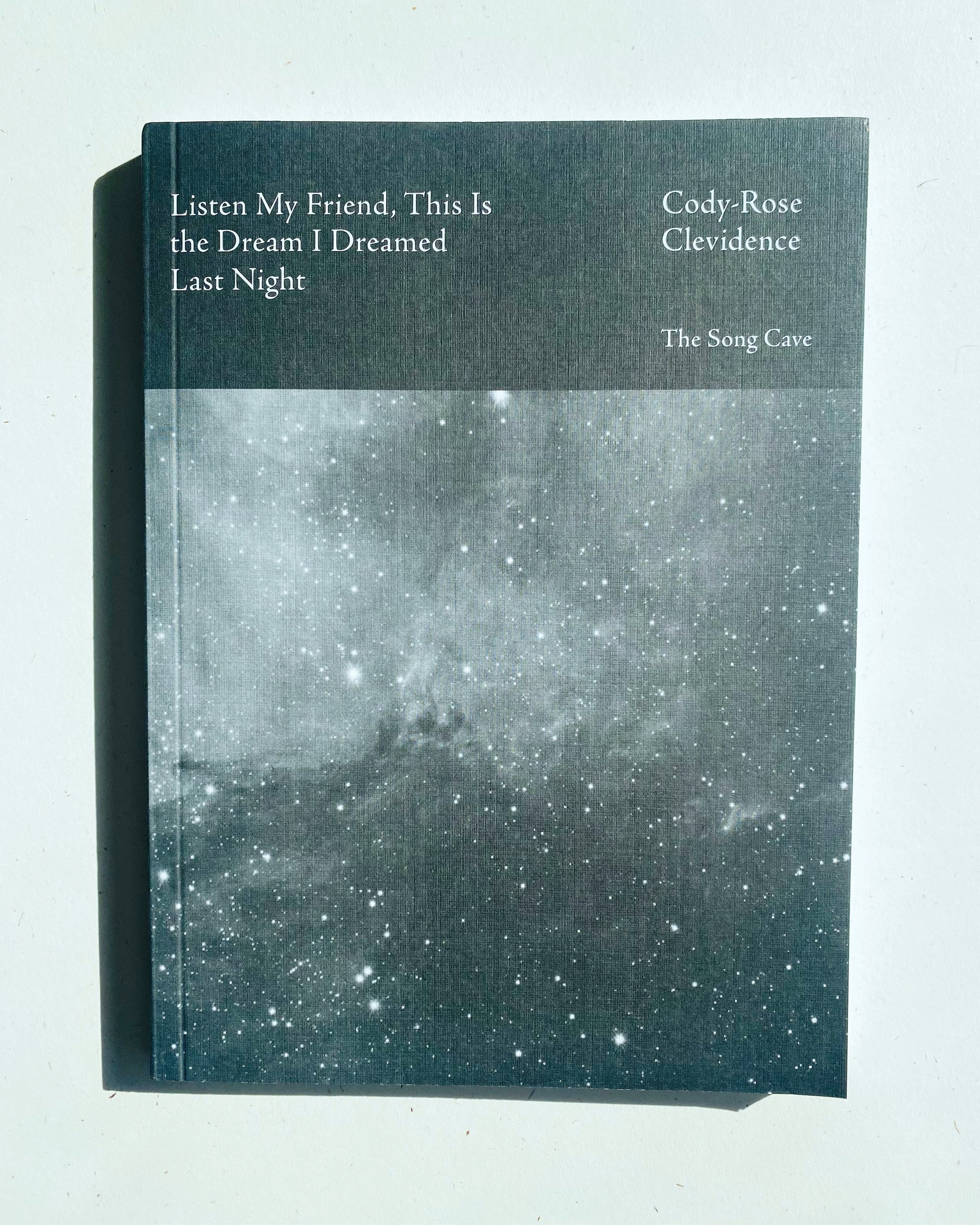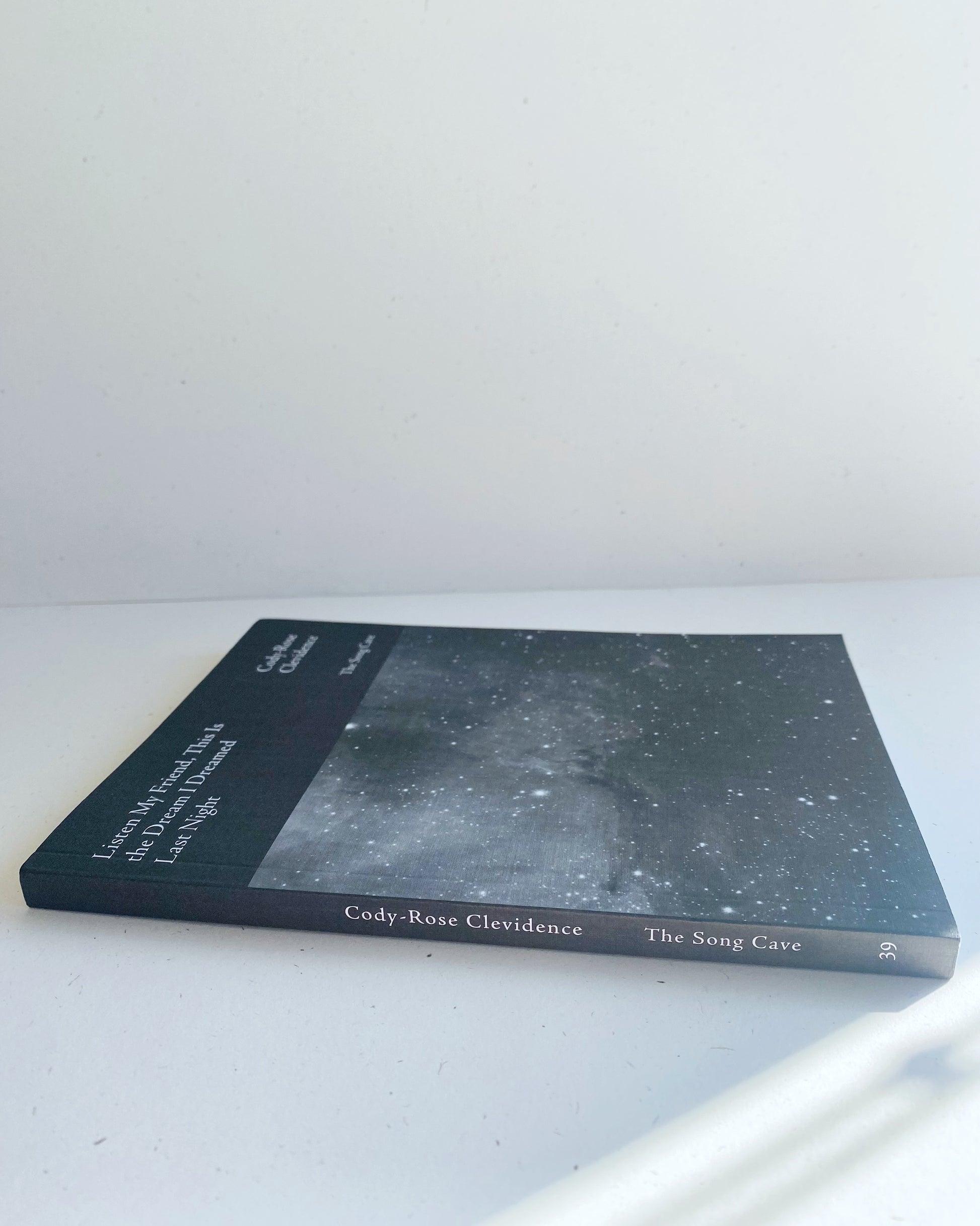 From the press: Unlike anything we've ever seen or published, Listen My Friend, This Is the Dream I Dreamed Last Night is a book of wonder in which poet Cody-Rose Clevidence layers the language of information with the language of the heart, constantly locating the connections between attention and perception. On each page local and global concerns combine in an effort to reveal what it’s like to live right now, during a pandemic in a broken world. With its uncategorizable form, somewhere between an essay and a prose poem, Clevidence mixes anthropology, poetry, autobiography, history, psychology, and philosophy, with subject matter ranging from agriculture, gender, justice, queerness, loneliness, pollution, space, guns, moths, family, grief, longing—it’s hard to name a subject relevant to our time that isn’t in this book. Clevidence’s deft movement between facts and feelings is immediate from the first page, with an inquisitive and searching voice stretched over one long, never-breaking block of prose, a catalogue that becomes revelatory by the end, allowing readers to imagine new ways of processing their own world.