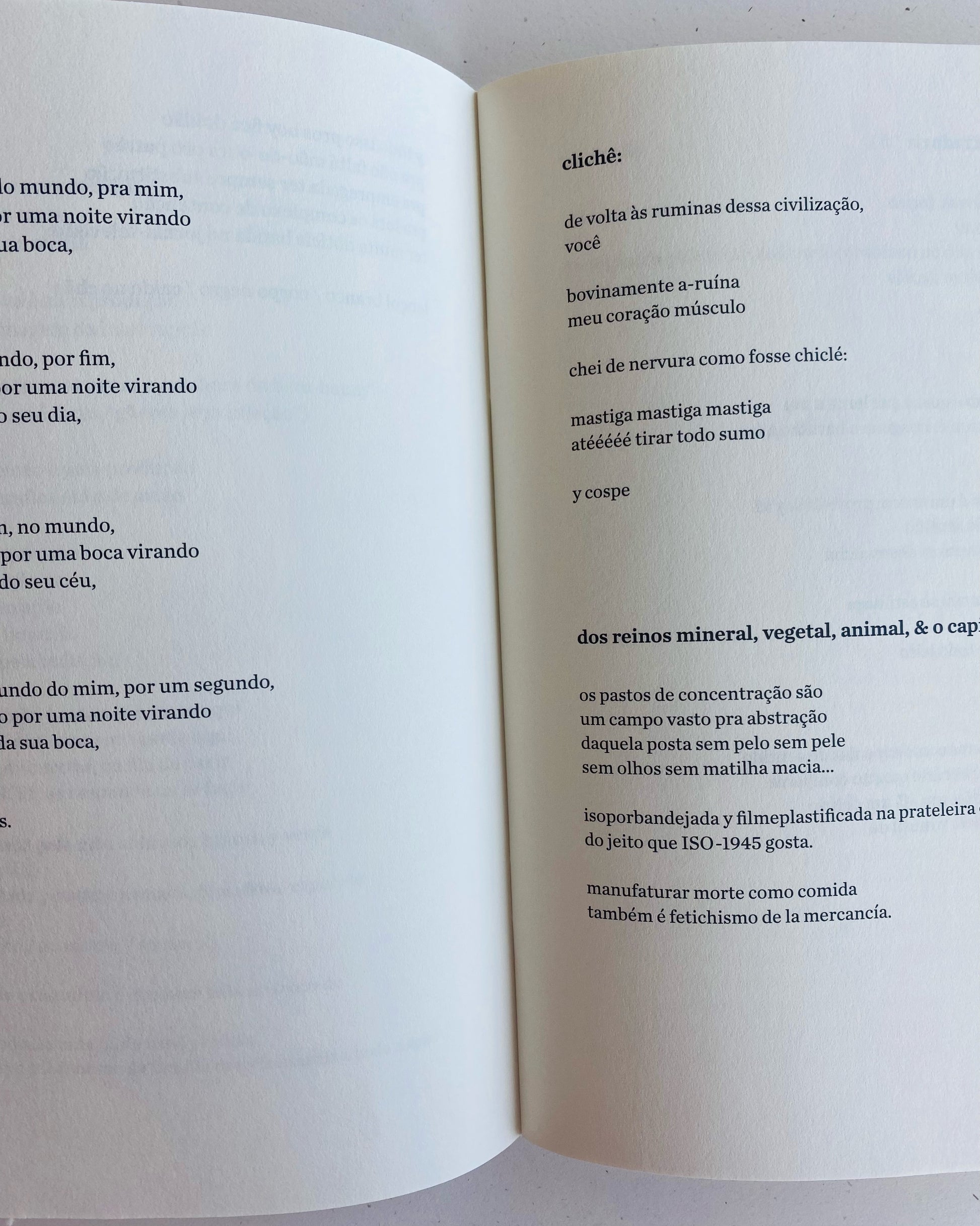 tatiana nascimento is from brasília, Brazil, she’s 41 years old, she’s a wordsmith: she invents poems, prose, songs, essays, translations, and handmade books. she has published almost two dozen books of her own, and more than 50 titles of other black/sexual dissident authors through padê editorial, her publishing house specialized in artisanal cardboard publications. Her research/production dives into silences, memories, noises, melodies, to disarchitect words and assemble a re-engineering of the senses, especially in the themes of affection, blackness, the brazilian savannah, the sea & her beloved daughter irê.
