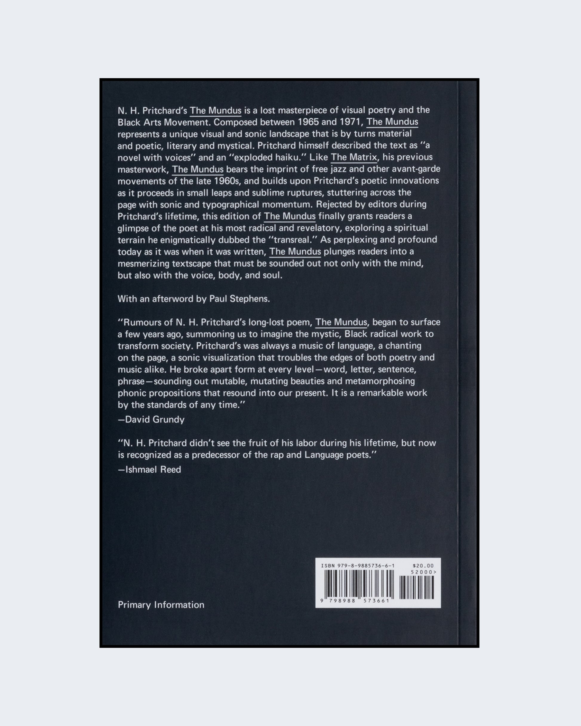 Pritchard found early success with his books The Matrix and EECCHHOOEESS, experimental texts that, in part, bear the imprint of the avant-garde arts, music, and poetry communities of the late 1960s, in particular the Umbra group, a collective of Black poets of which he was a leading member. But The Mundus finds Pritchard at his most radical and revelatory, putting forth a profound act of negation, while it delves readers into a primordial soundscape populated by language’s essential building blocks. An early pillar of Black poetics and a world unto itself, The Mundus must be sounded out not only with the mind, but also with the mouth, body, and soul.