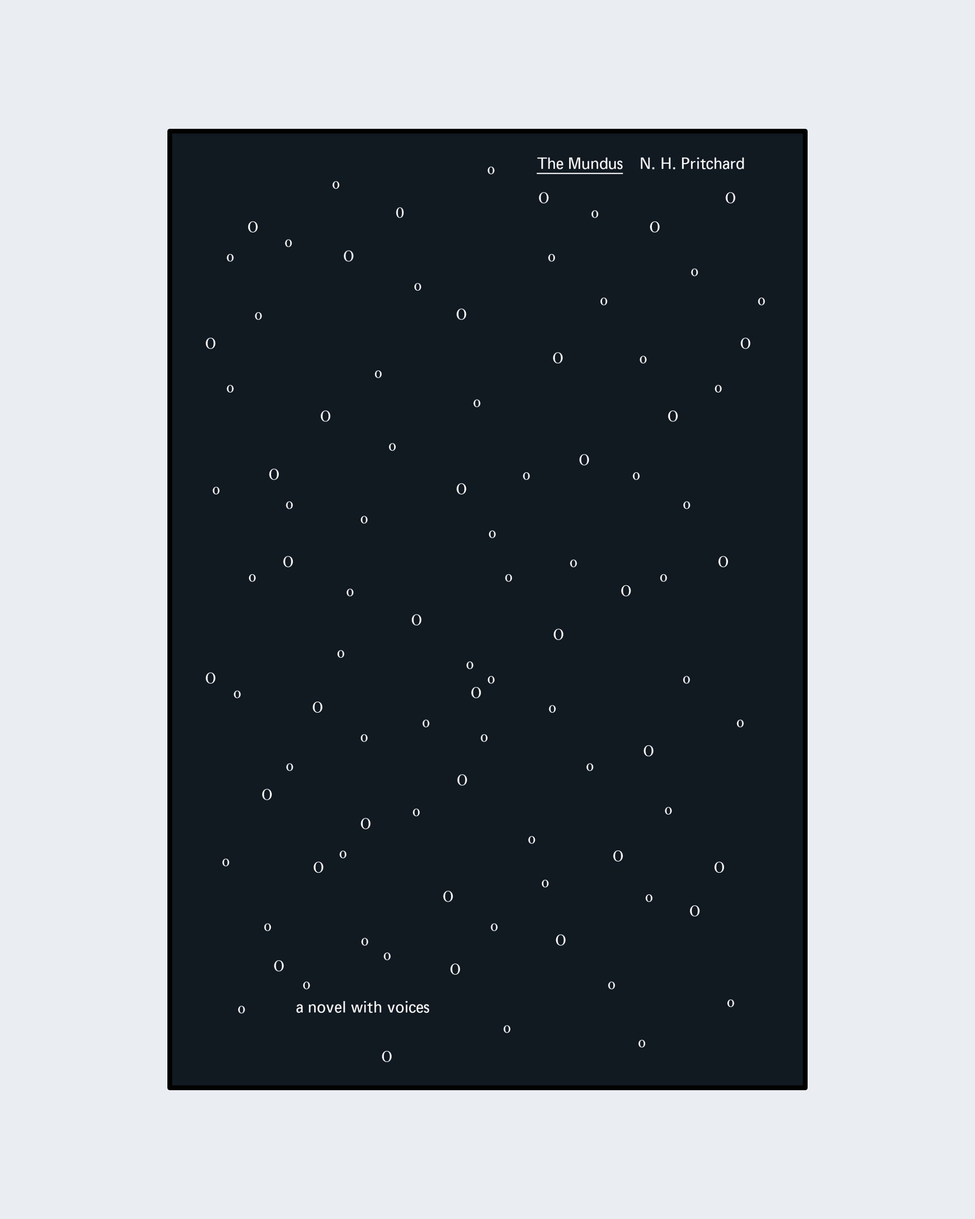 Subtitled “a novel with voices,” The Mundus combines Pritchard’s earlier poetic innovations with his growing interest in theosophy, exploring a spiritual terrain he enigmatically dubbed the transreal. Appropriately, this lost masterpiece represents some of Pritchard’s most challenging work, with the text proceeding in small leaps and sublime fractures, stuttering across the page with sonic and visual momentum as it threads through an immersive, textual mist comprised solely of the letter “o”.