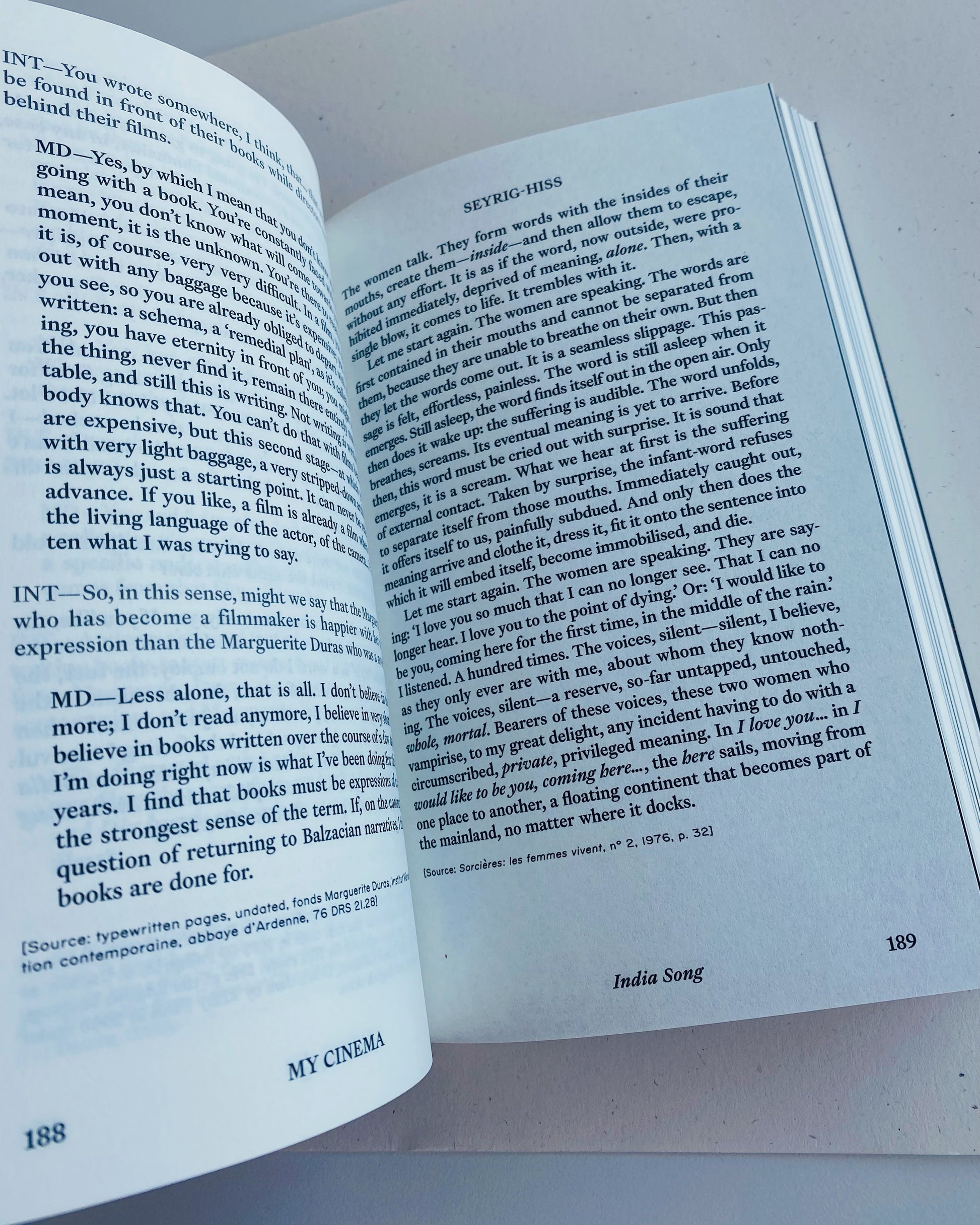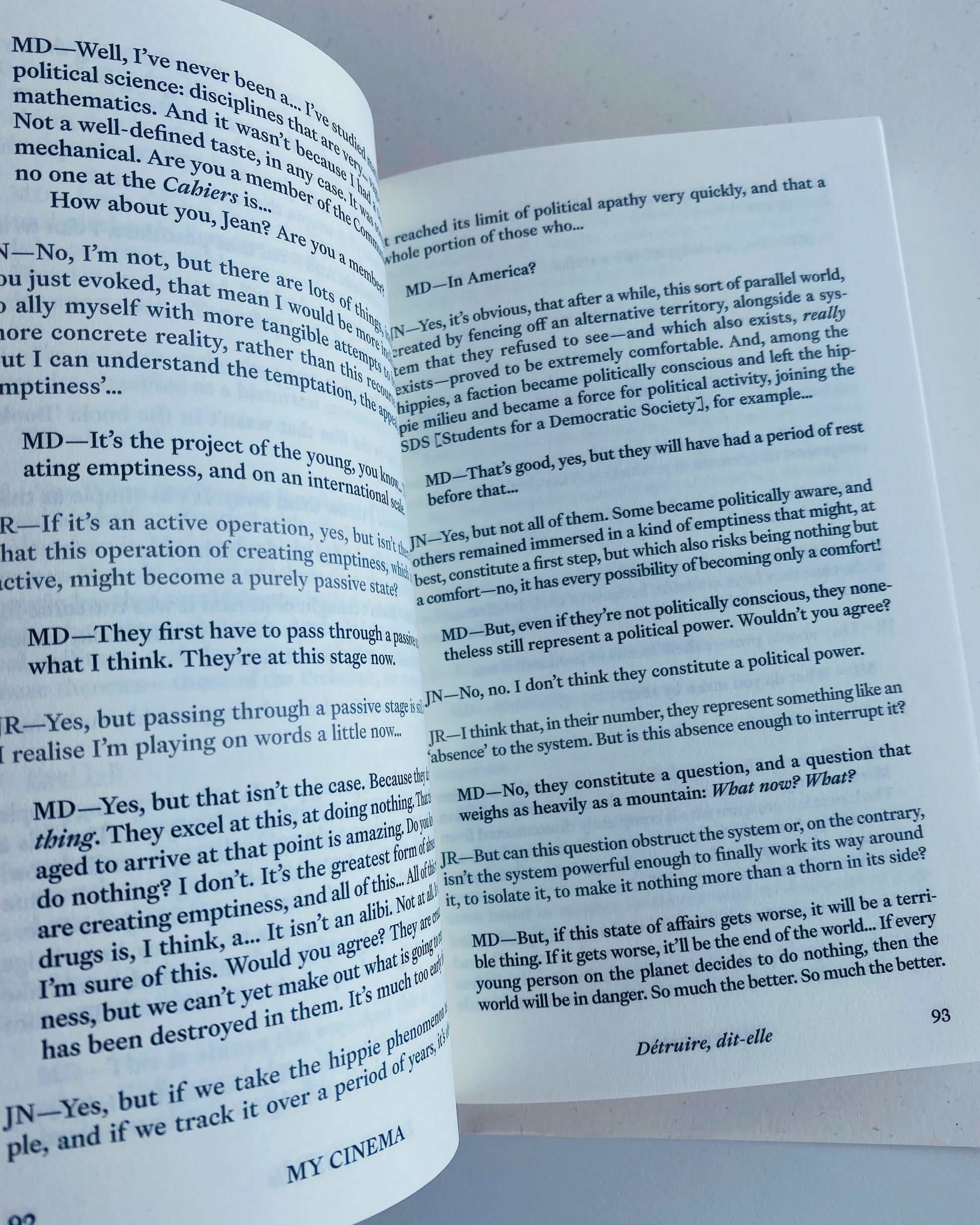 Working chronologically through her nineteen films, made between 1966 and 1985, this collection of reflections by Marguerite Duras (1914–1996) includes non-standard press releases, notes to her actors, letters to funders, short essays on themes as provocatively capacious as ‘mothers’ and ‘witches’, as well as some of the most significant interviews she gave about her cinematic and writing practices (with filmmakers and critics including Jacques Rivette, Caroline Champetier and Jean Narboni).