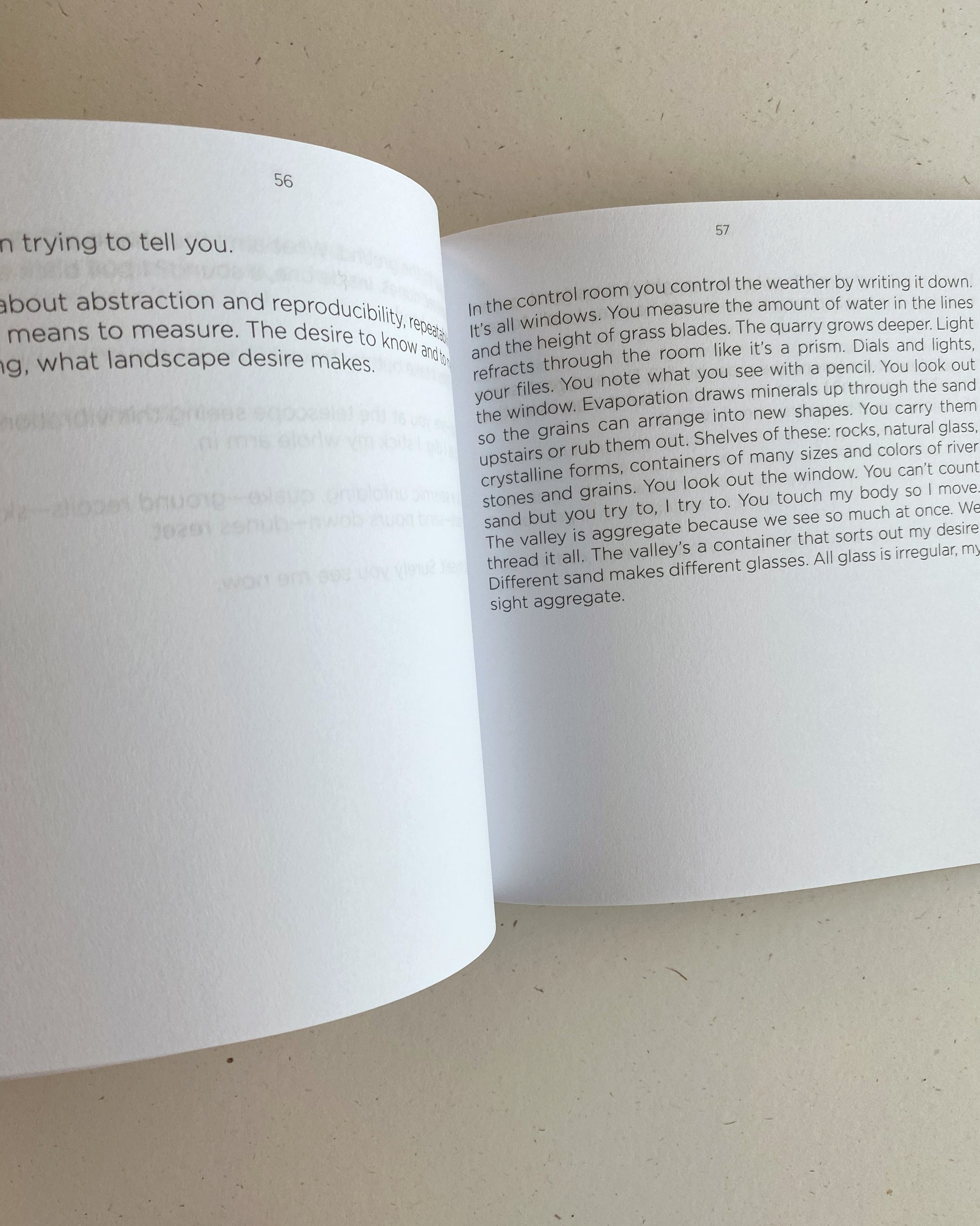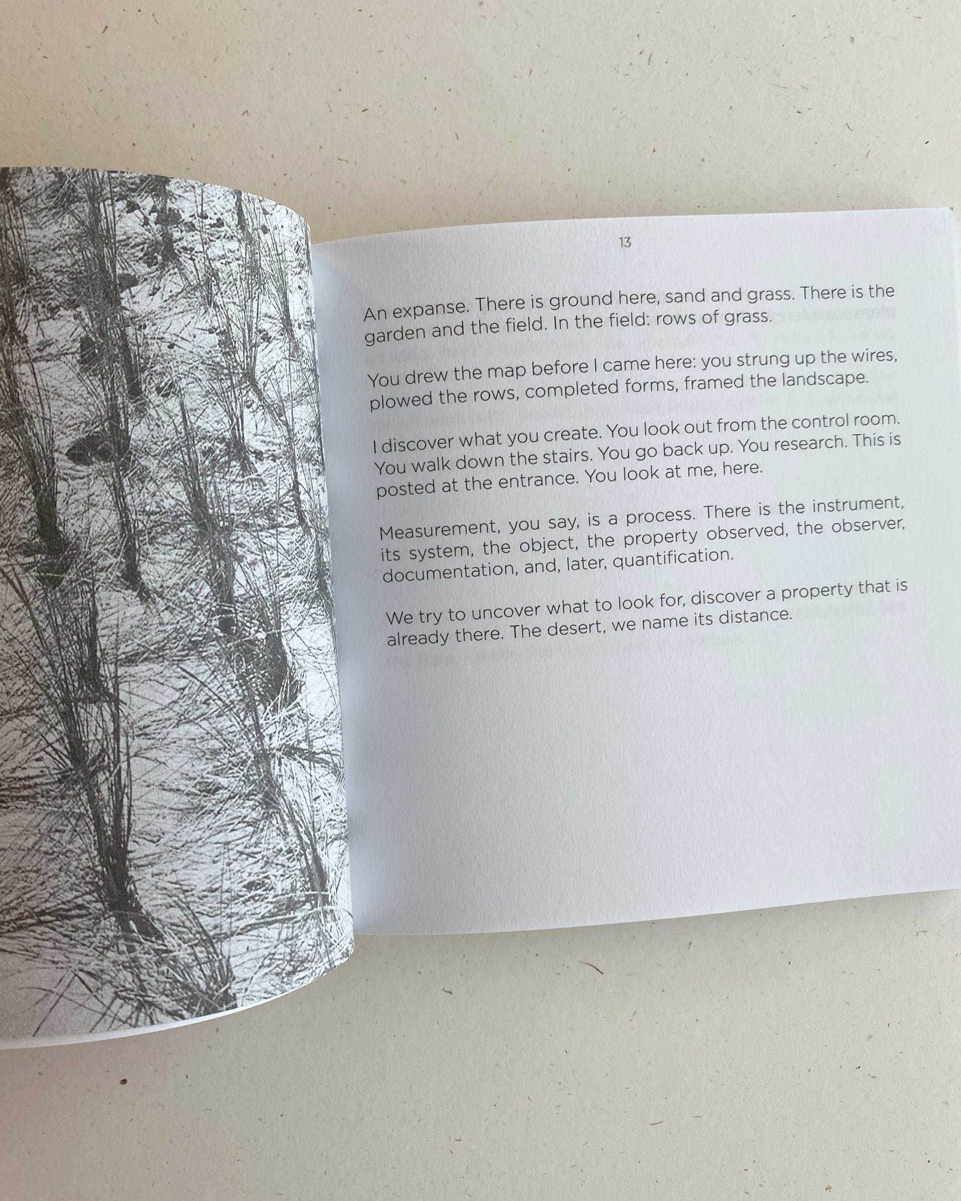 The scientific task of measurement and documentation on such a scale, and in such a changing landscape, is impossible, and this is layered with the desire to know and be with another through the same lens, with the same language. The repetition required of scientific processes is not unlike romantic obsession. Here, performative acts of measurement create a scientific erotics, an installation the reader moves through, an atmosphere susceptible to weather.