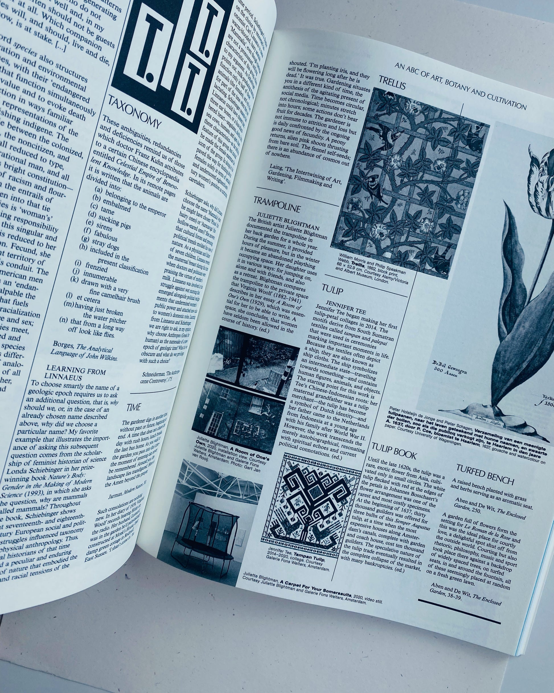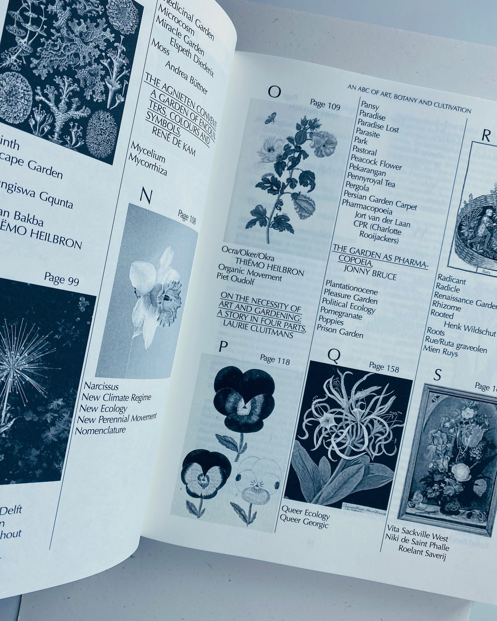 Entries include: Anthropocene, Arcadia, Bouquet, Roberto Burle Marx, Compost, Dumbarton Oaks, Edible Estates, Ermenonville, Ian Hamilton Finlay, Herb Garden, Japanese Garden, Derek Jarman, Kew Gardens, Lawn, Park, Quaker Garden, Queer Ecology, Roots, Vita Sackville-West, Versailles, Vibrant Matter and Zen Garden.