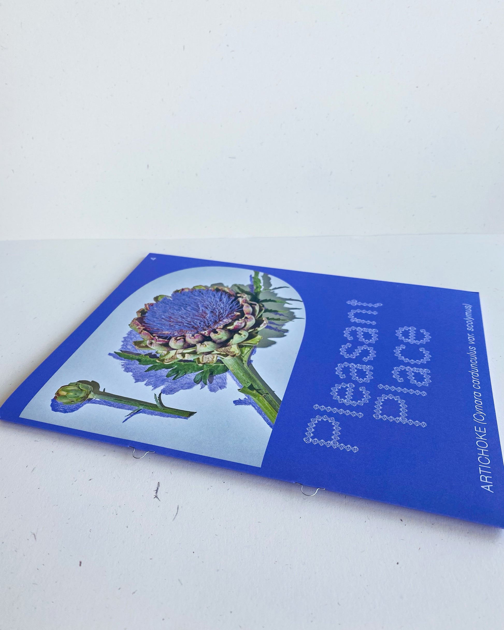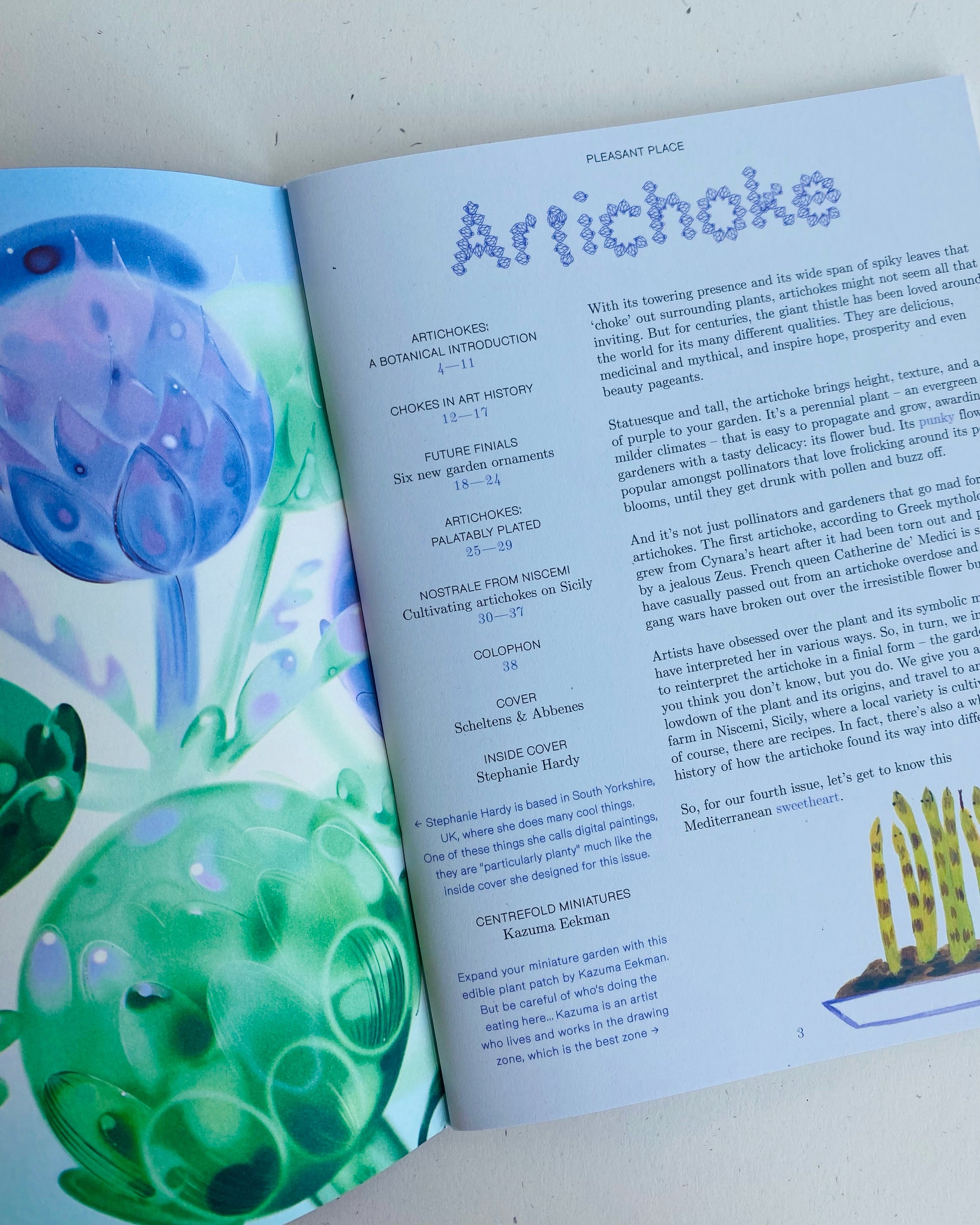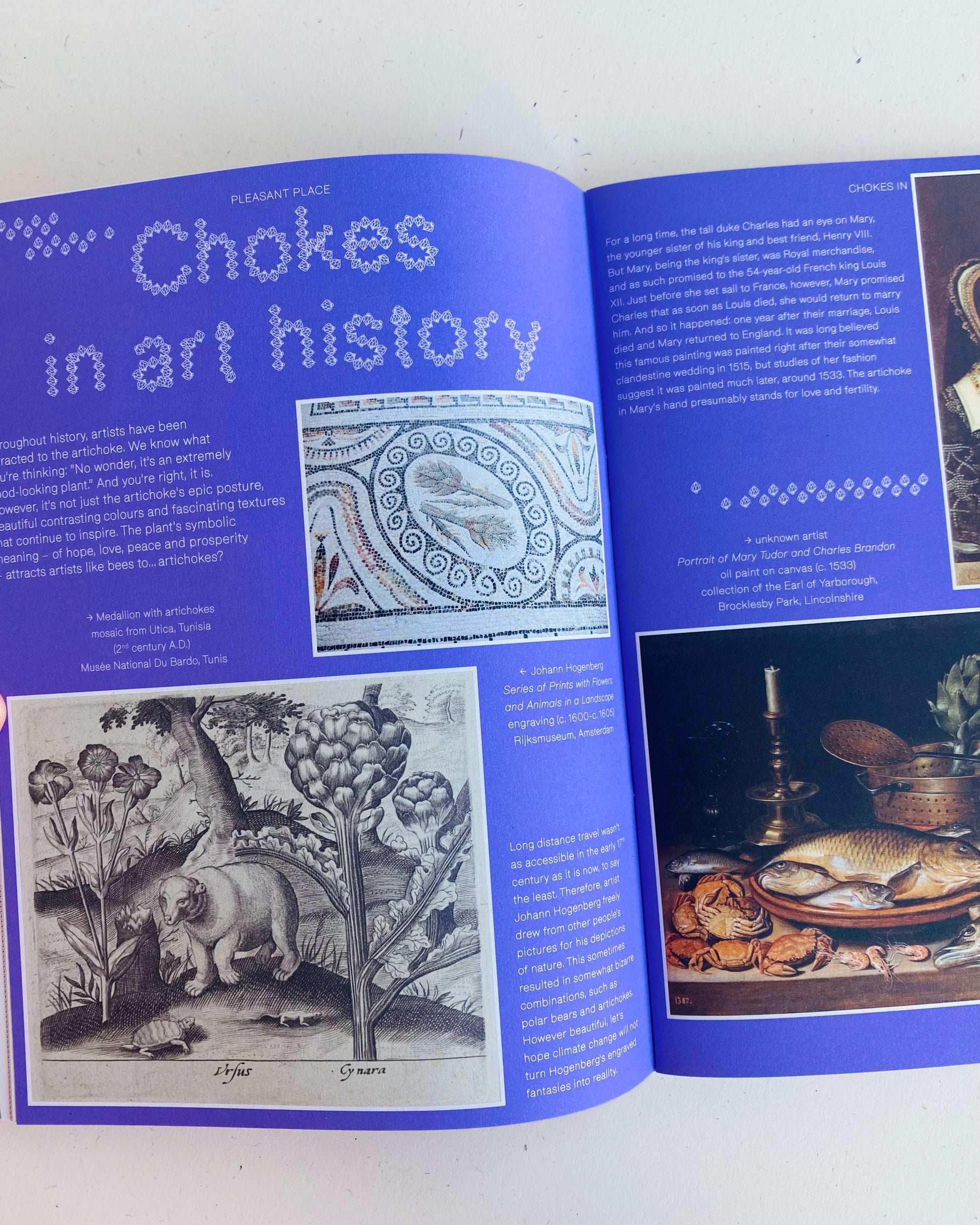 From the press: 'Pleasant Place' is a growing collection of publications about the art of gardening, offering both practical and in-depth information on everyday garden tasks and garden design. The fourth issue is all about the Artichoke (Cynara cardunculus var. Scolymus), a monumental perennial thistle that deserves a place in both gardens and kitchens alike. This issue includes a botanical introduction, an overview of artichokes in art history, six artists interpretation of artichoke finials, a visual essay on cultivating artichokes in Niscemi (IT) and international artichoke recipes. As always, a set of garden miniatures can be found in the centerfold.
