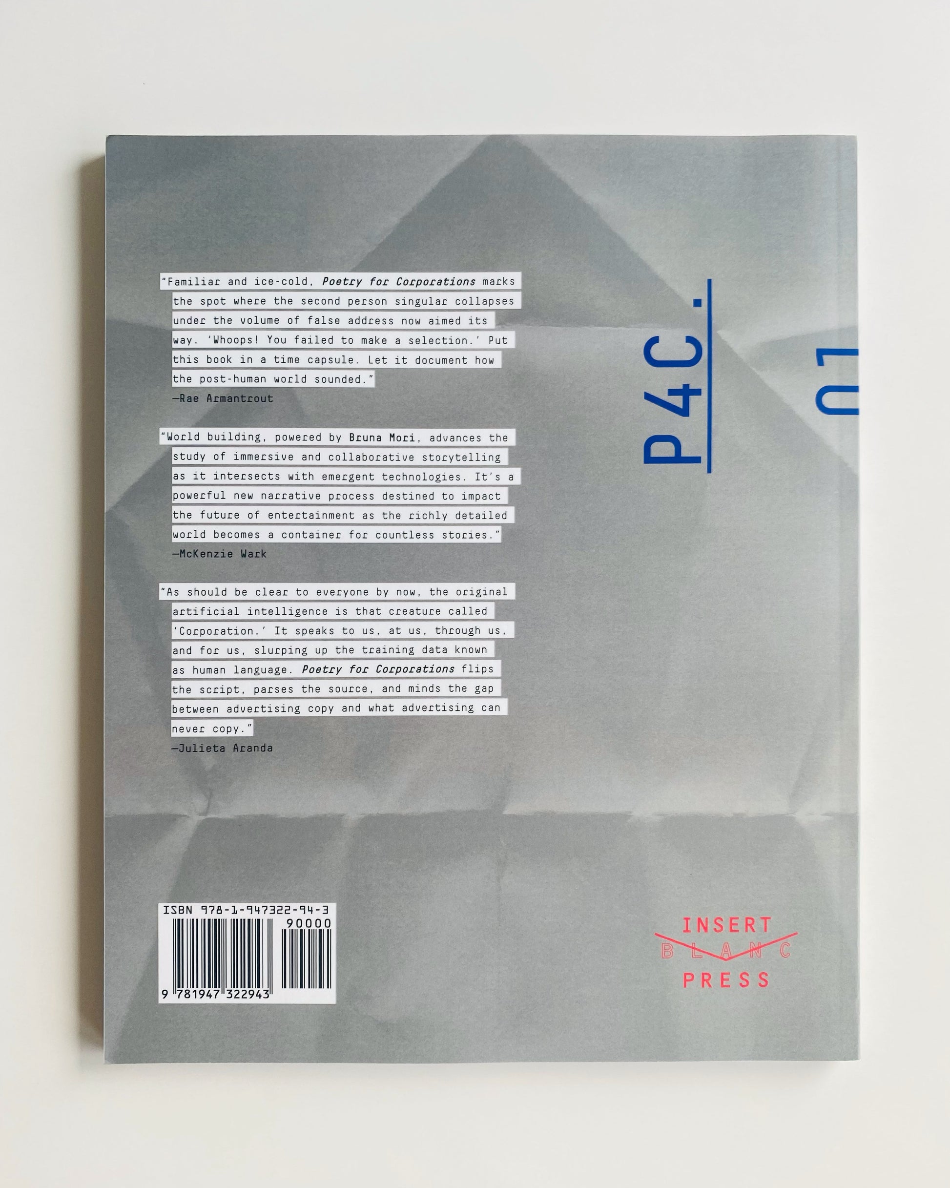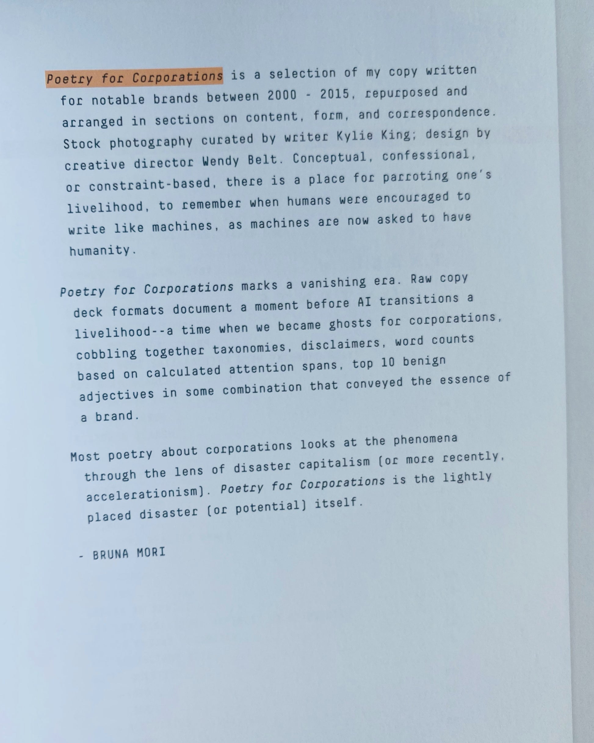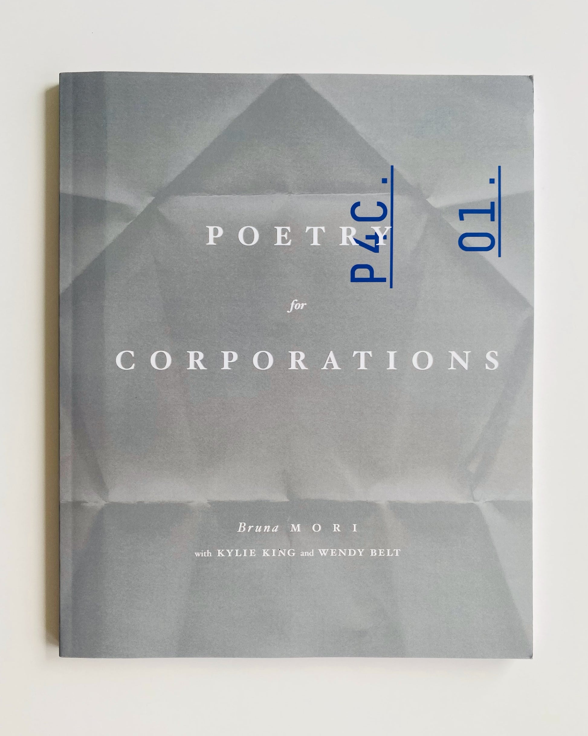 Most poetry about corporations looks at the phenomena through the lens of disaster capitalism (or more recently, accelerationism). Poetry for Corporations is the lightly placed disaster (or potential) itself. —Bruna Mori
