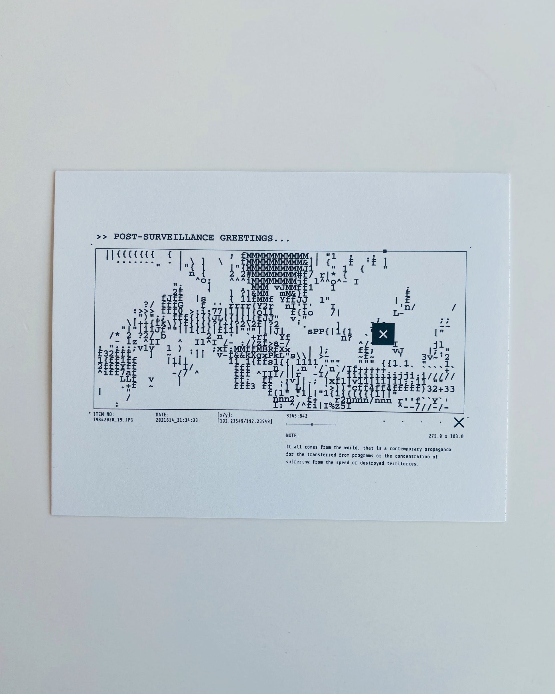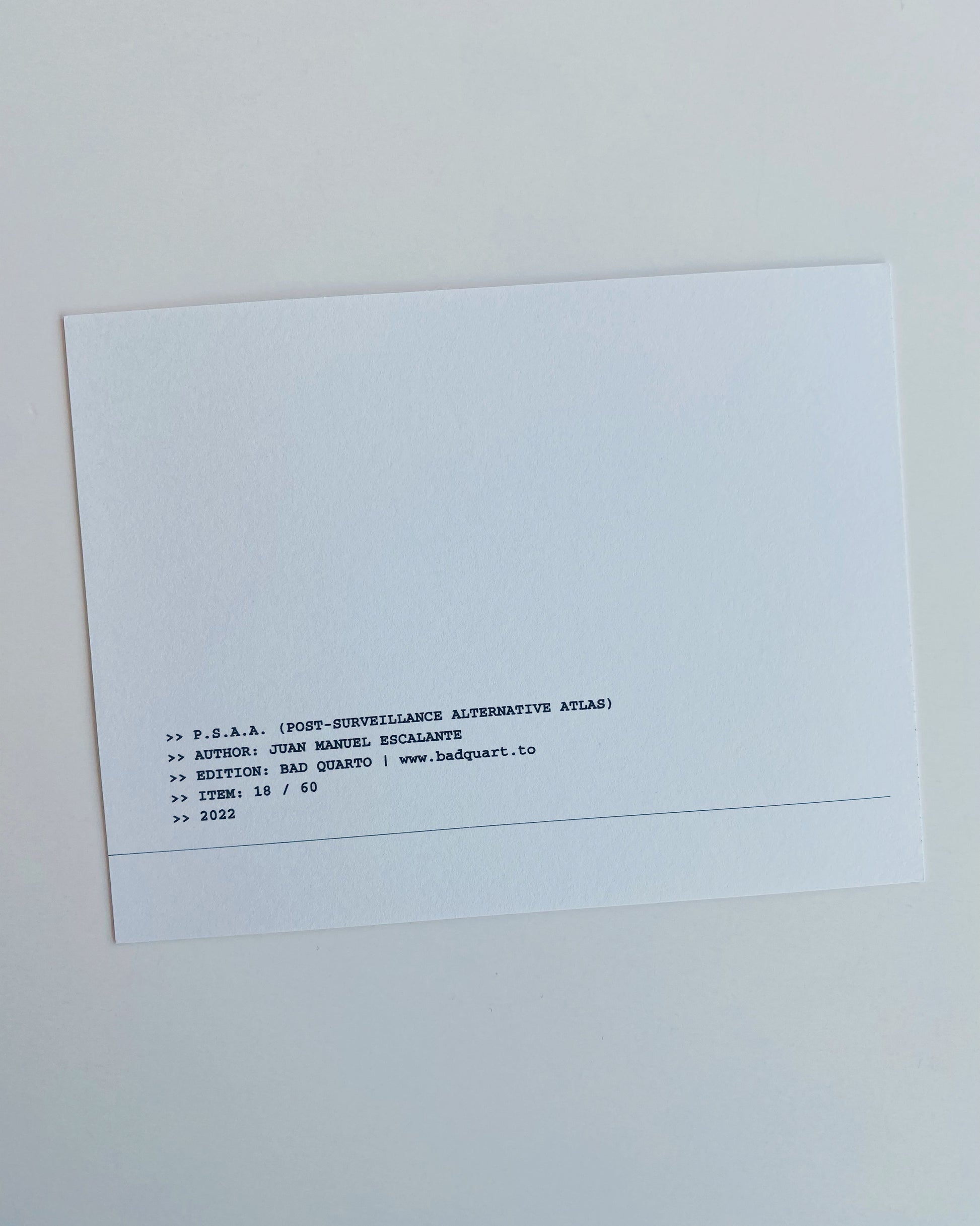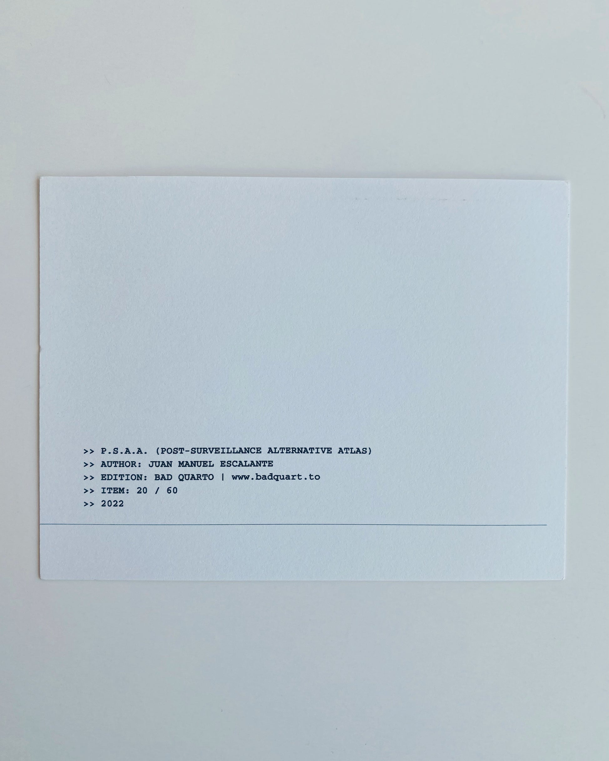 From the press: Each Post-Surveillance Postcard is one of a set of 60, with text and images generated using the processes of Juan Manuel Escalante’s Post-Surveillance Alternative Atlas project. These can be sent through the US mail as postcards, if appropriate postage is affixed.