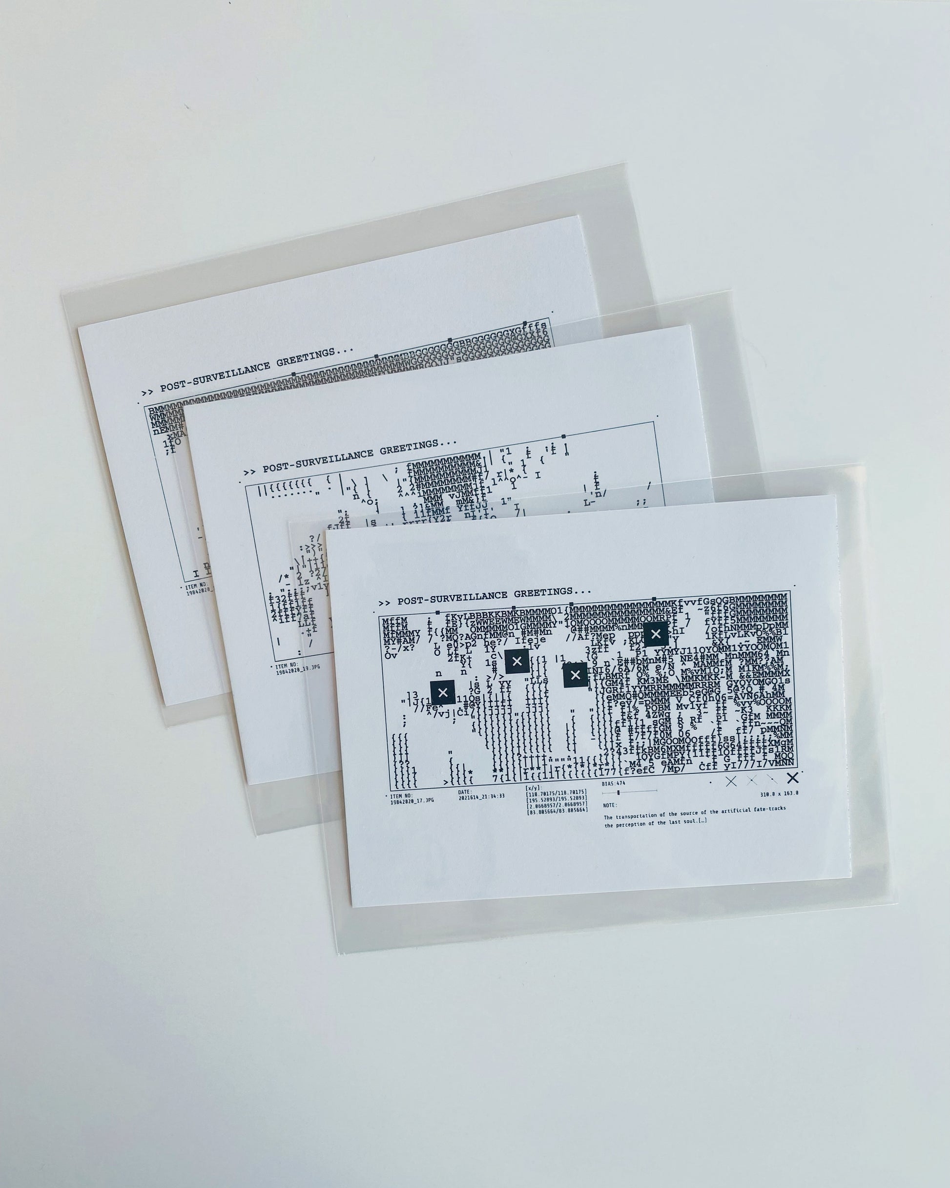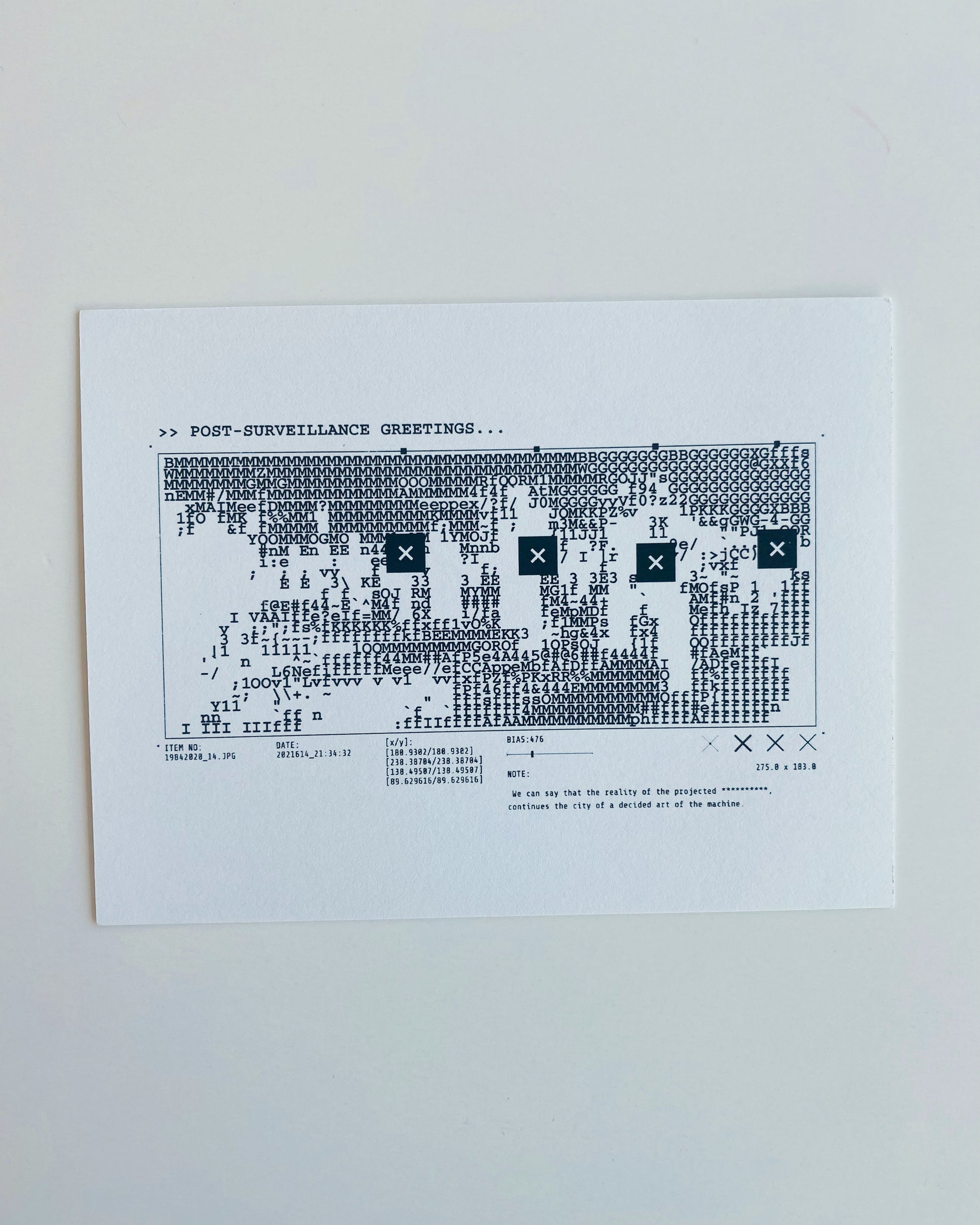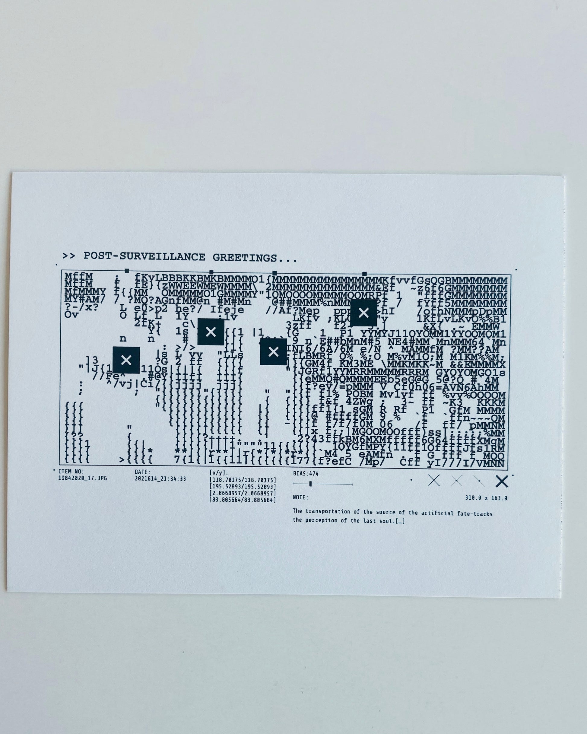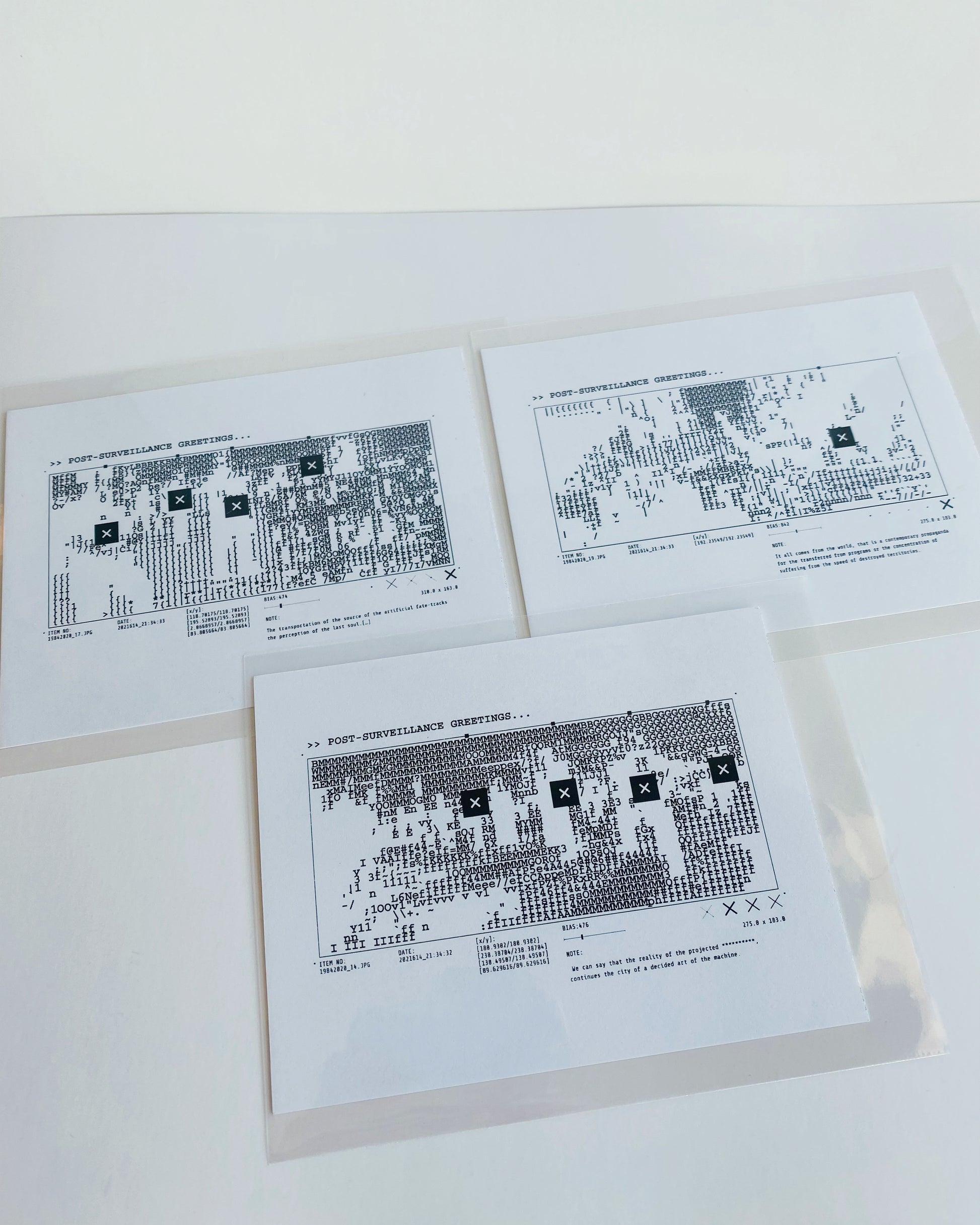 From the press: Each Post-Surveillance Postcard is one of a set of 60, with text and images generated using the processes of Juan Manuel Escalante’s Post-Surveillance Alternative Atlas project. These can be sent through the US mail as postcards, if appropriate postage is affixed.