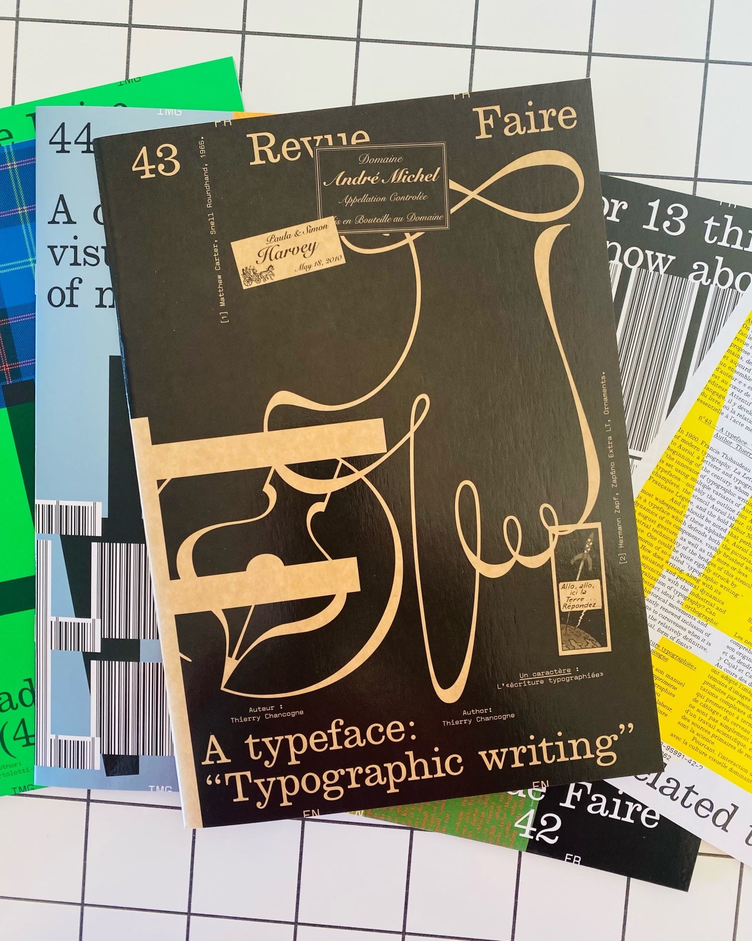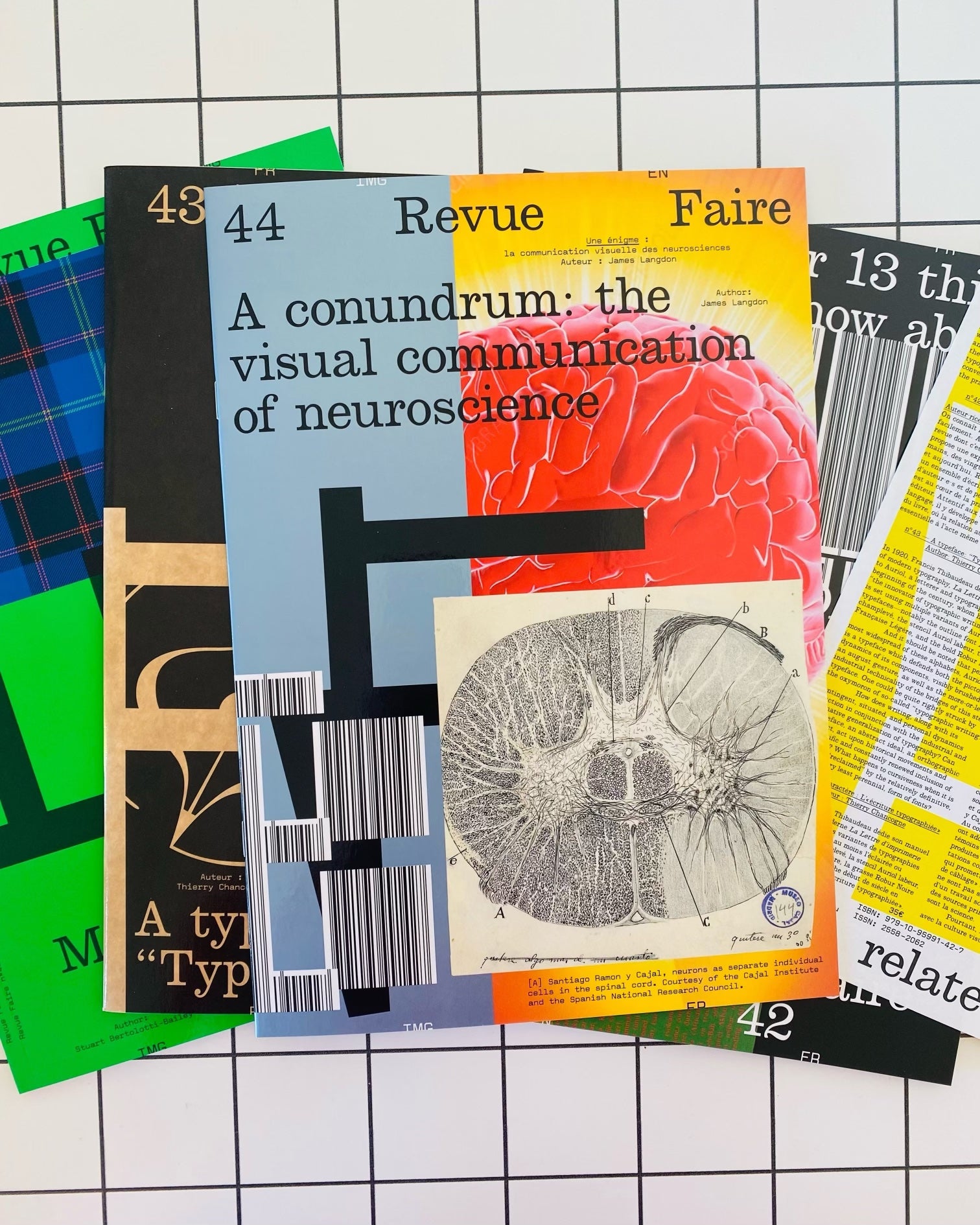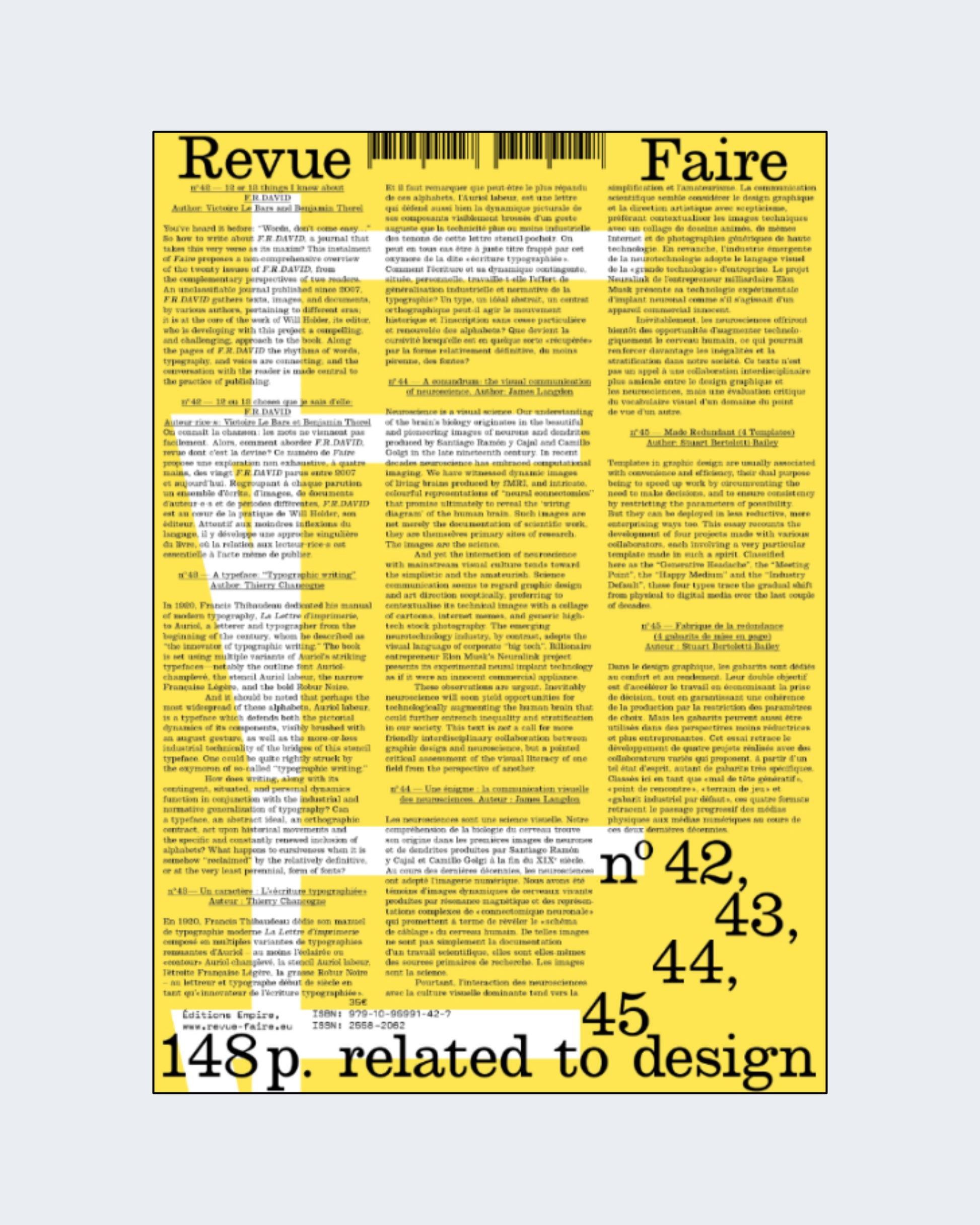 From the press: ‘Faire’ is distributed in the form of anthologies of three or four issues. This volume kicks off with a non-comprehensive overview by Victoire Le Bars and Benjamin Thorel of 20 issues of ‘F.R.DAVID’, the unclassifiable journal that emerged in 2007. Thierry Chancogne then offers an analysis of typographic writing, seeking to answer how writing, with its personal dynamics, functions in conjunction with the industrial and normative generalisation of typography. Furthermore, James Langdon looks at the conundrum of the visual communication of neuroscience, while Stuart Bertolotti-Bailey analyses the inherent redundancy of graphic design templates in four case studies.