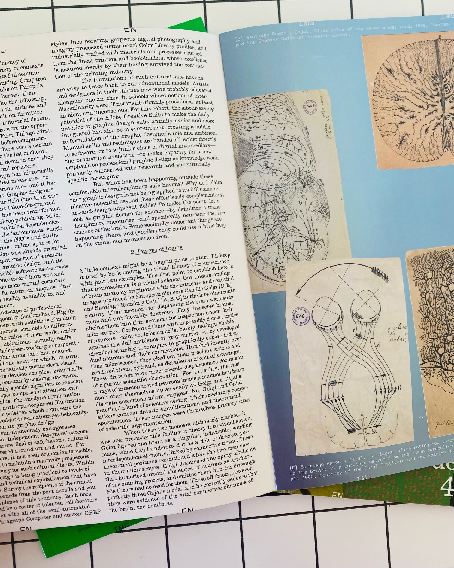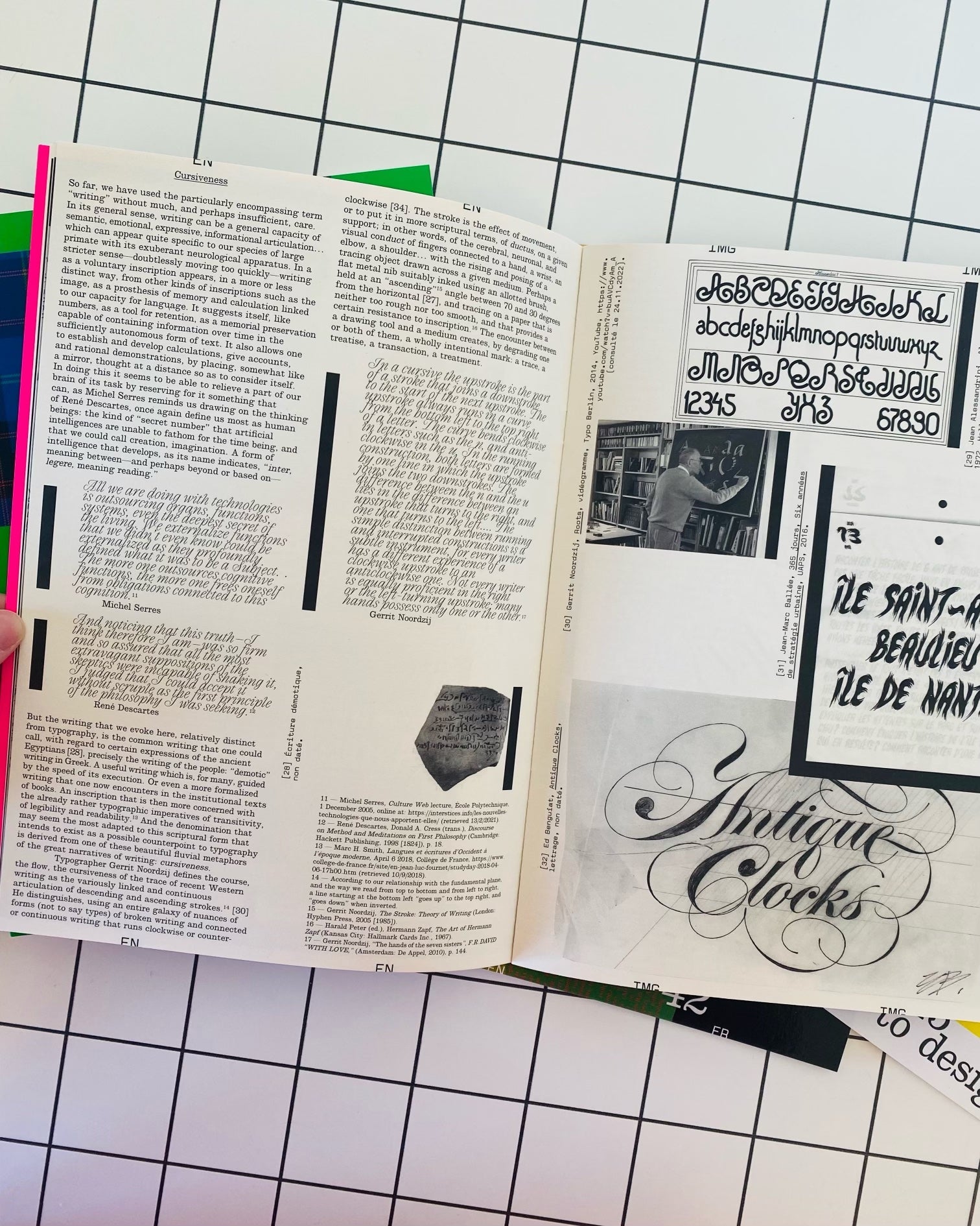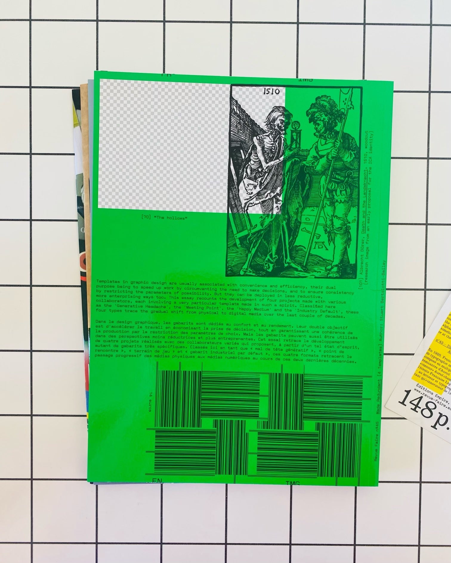 From the press: ‘Faire’ is distributed in the form of anthologies of three or four issues. This volume kicks off with a non-comprehensive overview by Victoire Le Bars and Benjamin Thorel of 20 issues of ‘F.R.DAVID’, the unclassifiable journal that emerged in 2007. Thierry Chancogne then offers an analysis of typographic writing, seeking to answer how writing, with its personal dynamics, functions in conjunction with the industrial and normative generalisation of typography. Furthermore, James Langdon looks at the conundrum of the visual communication of neuroscience, while Stuart Bertolotti-Bailey analyses the inherent redundancy of graphic design templates in four case studies.