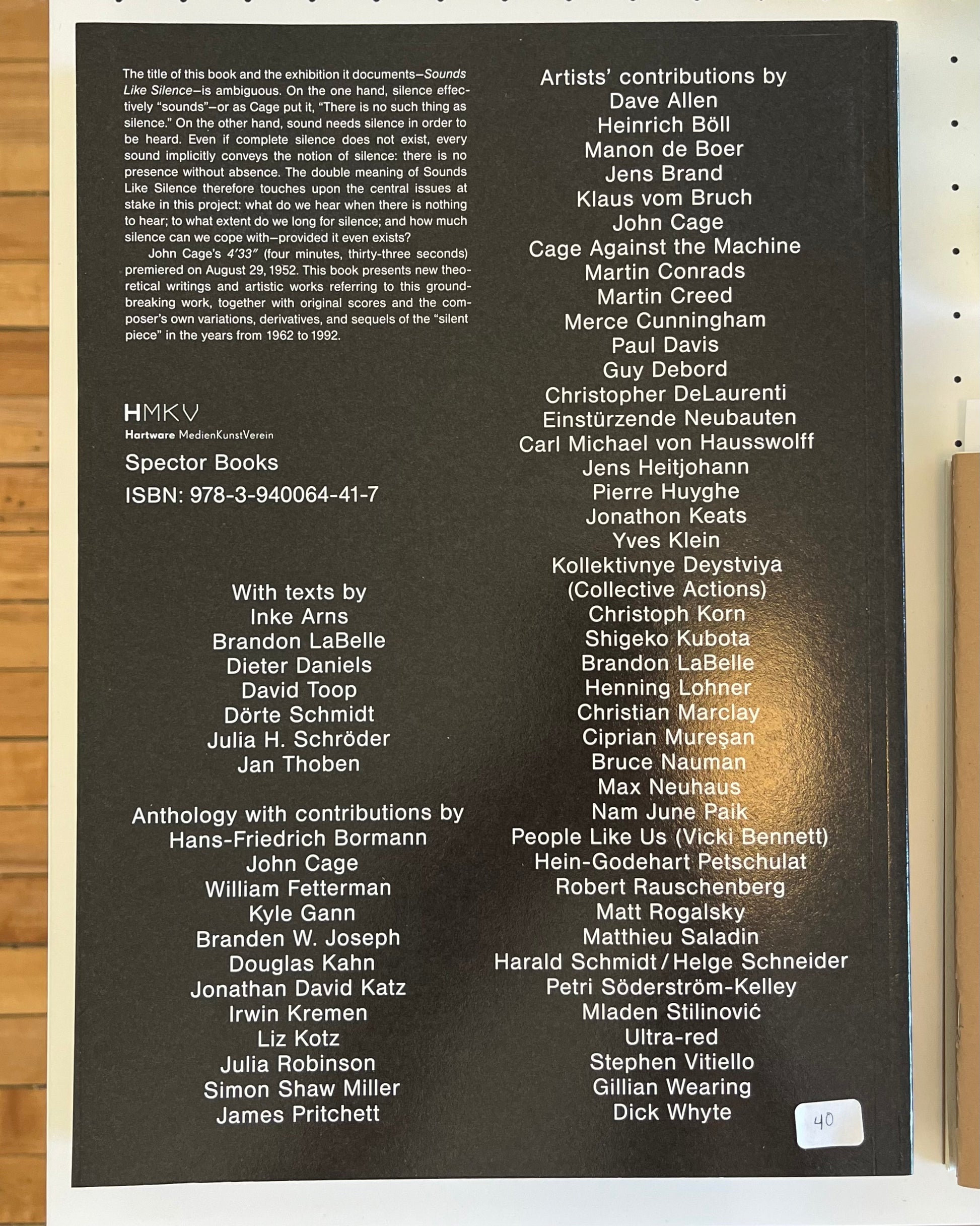From the press: The title of this book and the exhibition it documents—Sounds Like Silence—is ambiguous. On the one hand, silence effectively »sounds«—or as Cage put it, »There is no such thing as silence.« On the other hand, sound needs silence in order to be heard. Even if complete silence does not exist, every sound implicitly conveys the notion of silence: there is no presence without absence. The double meaning of Sounds Like Silence therefore touches upon the central issues at stake in this project: what do we hear when there is nothing to hear; to what extent do we long for silence; and how much silence can we cope with—provided it even exists?