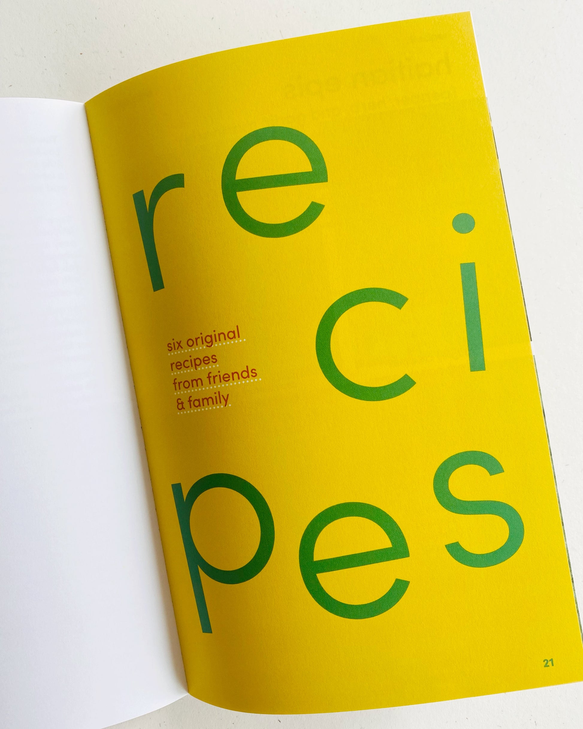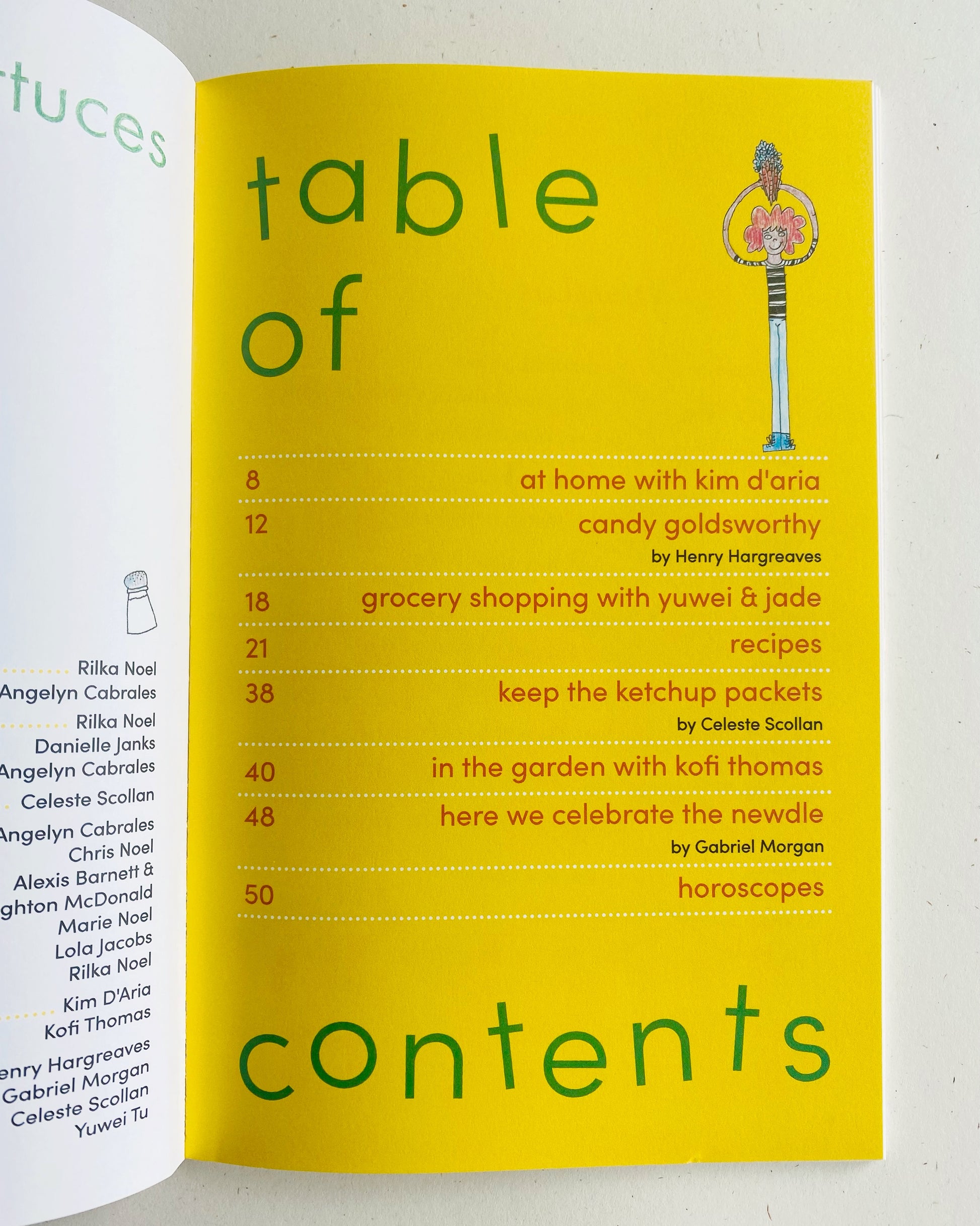 Issue 1, released in Summer 2023, is a zine that features original recipes by Rilka Noel, Angelyn Cabrales, Marie Noel, Chris Noel, Lola Jacobs, Alexis Barnett, Leighton McDonald; interviews with Kim D’Aria, Kofi Thomas; features by Henry Hargreaves, Gabriel Morgan, Celeste Scollan, Yuwei Tu; illustrations by Danielle Janks, Angelyn Cabrales, Rilka Noel.