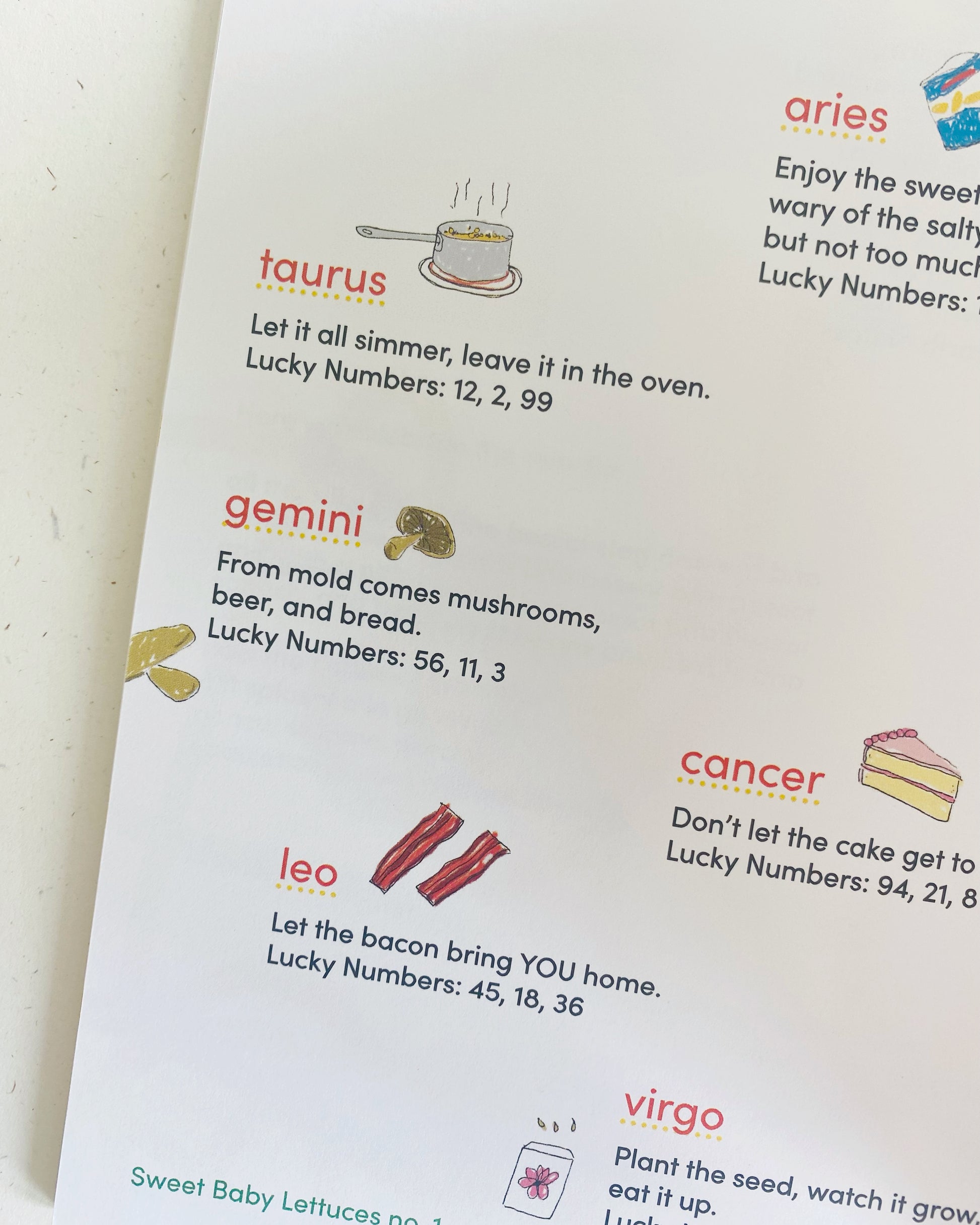 From the press: A food zine featuring recipes, interviews, illustrations, a poem, a story, and more: sweet baby lettuces is a food project by Rilka Noel in partnership with her favorite designer and friend, Angelyn Cabrales.