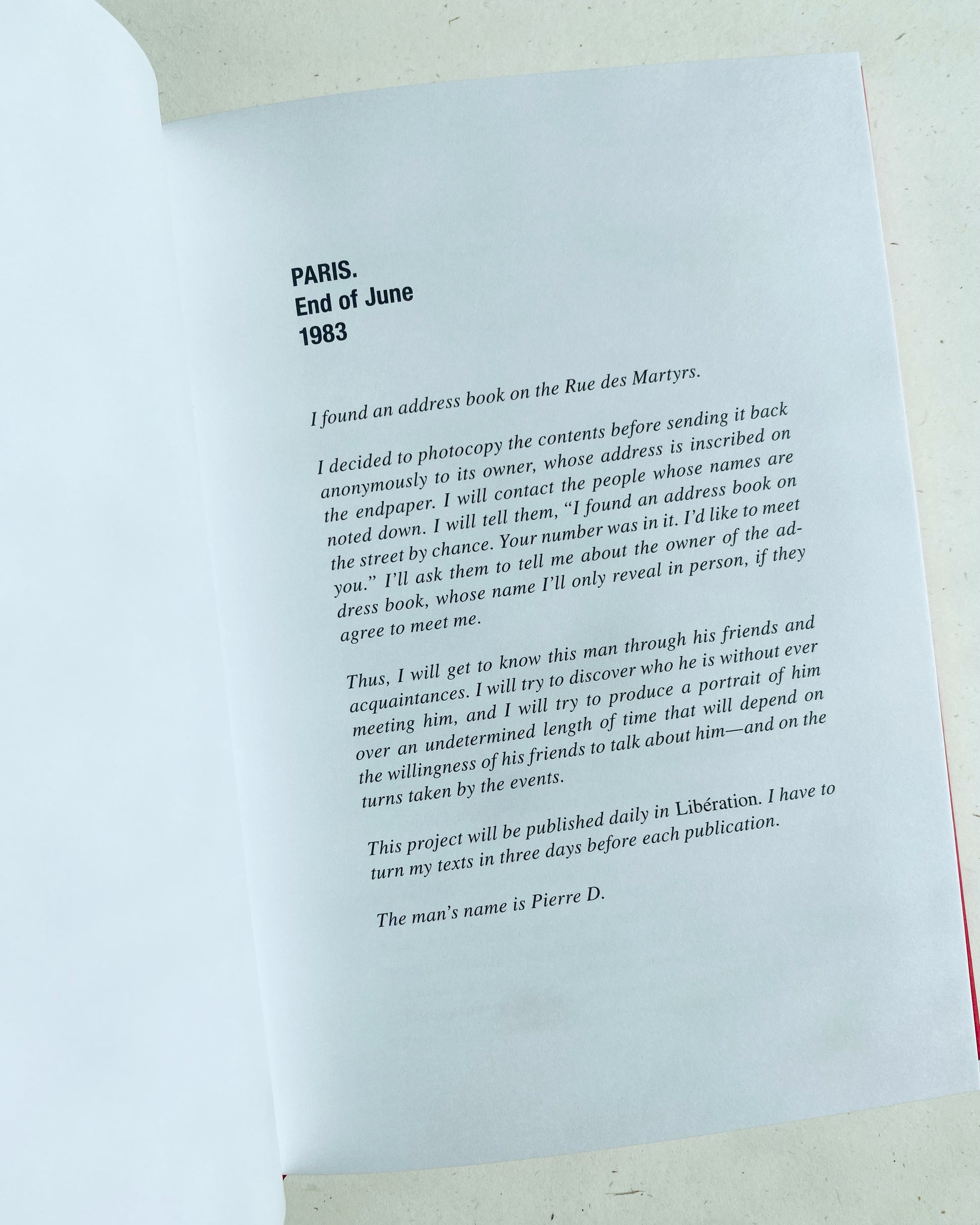 As The Address Book entries accumulate, so do the vivid impressions of its owner, Pierre D., while suggesting ever more complicated stories as information is gifted, parsed, and withheld. A multitude of details—from the seemingly banal to the potentially revelatory—are collaged into a fragile and strangely intimate portrait of Pierre D.; while Calle, over the course of her pursuit, also turns the interrogation on herself, her own fears, assumptions, and obsessions.