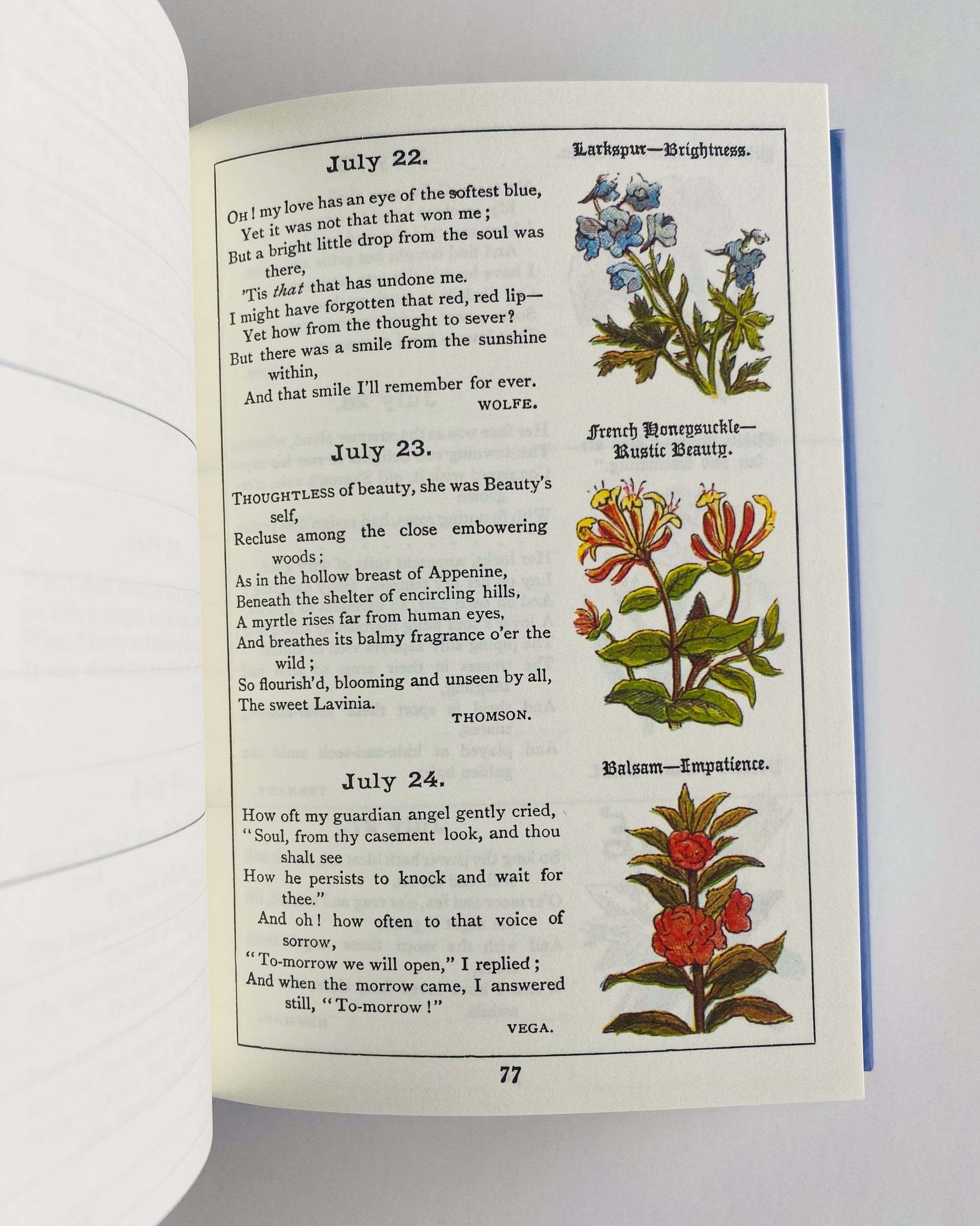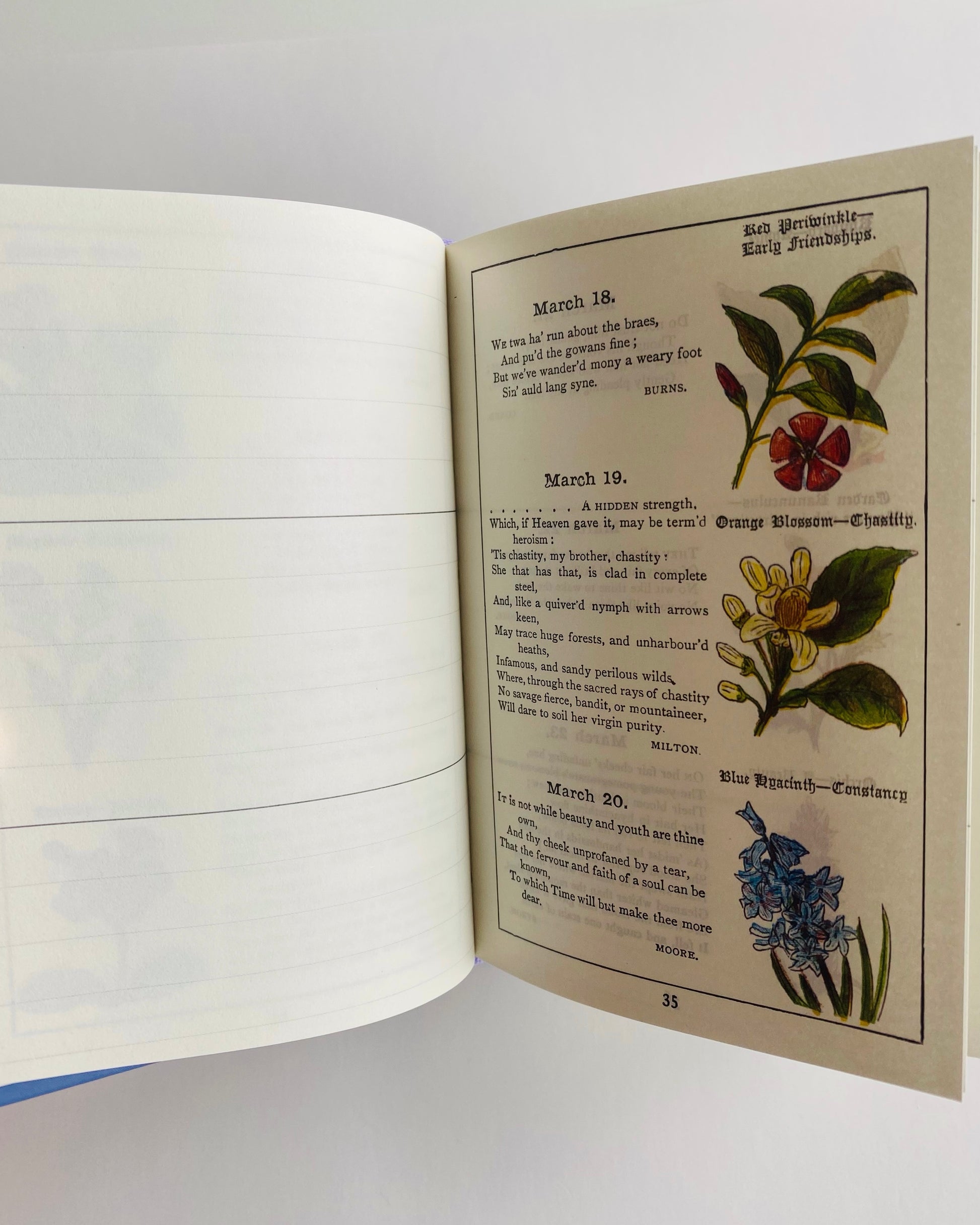 From the press: This reproduction of a Victorian birthday reminder book entwines flowers and their emblems with great poetry. Three hundred and sixty-five color engravings grace this little book--which is perfect for keeping track of birthdays or anniversaries. Each day of the year is beautifully illustrated with a flower and a quote from a poem.