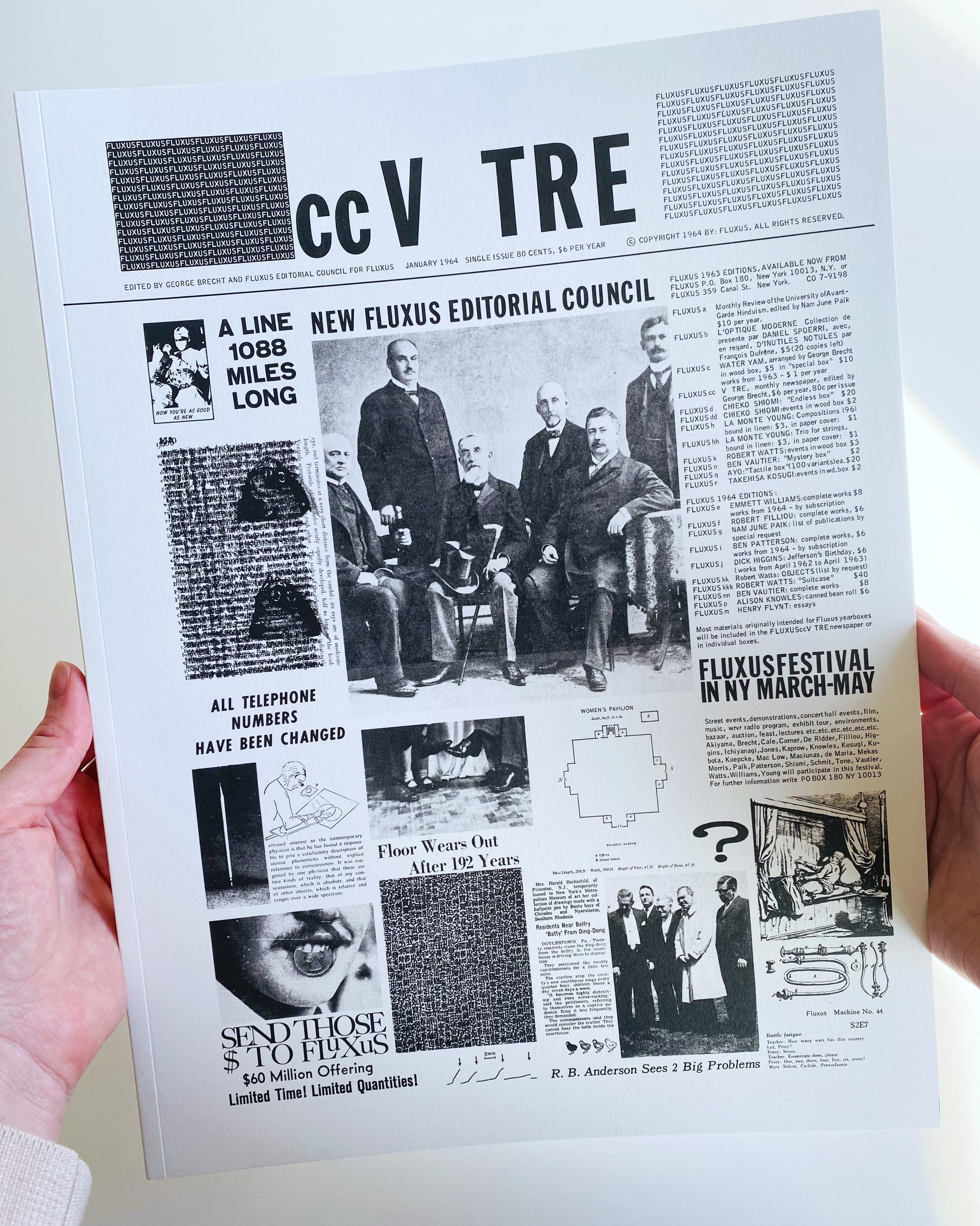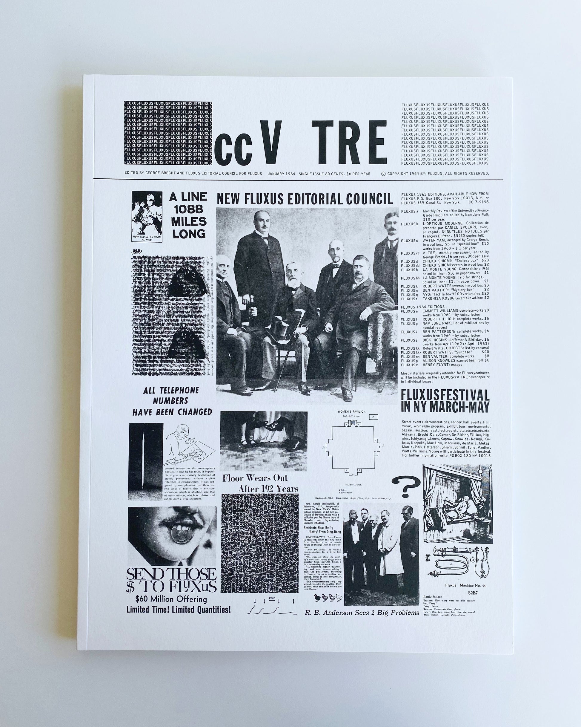 Issues of the newspapers were originally designated as cc V TRE after the earlier, one-off publication V TRE, which artist George Brecht released on occasion of the Yam Festival (1963). The use of “cc” in these early issues indicated that the publication was a copy of Brecht’s original version. After the first two releases, the editors started to play with various other titles containing “V TRE,” producing issues titled cc Valise e ThReE, Vacuum TRapEzoid, and Vaseline sTREet, among others.
