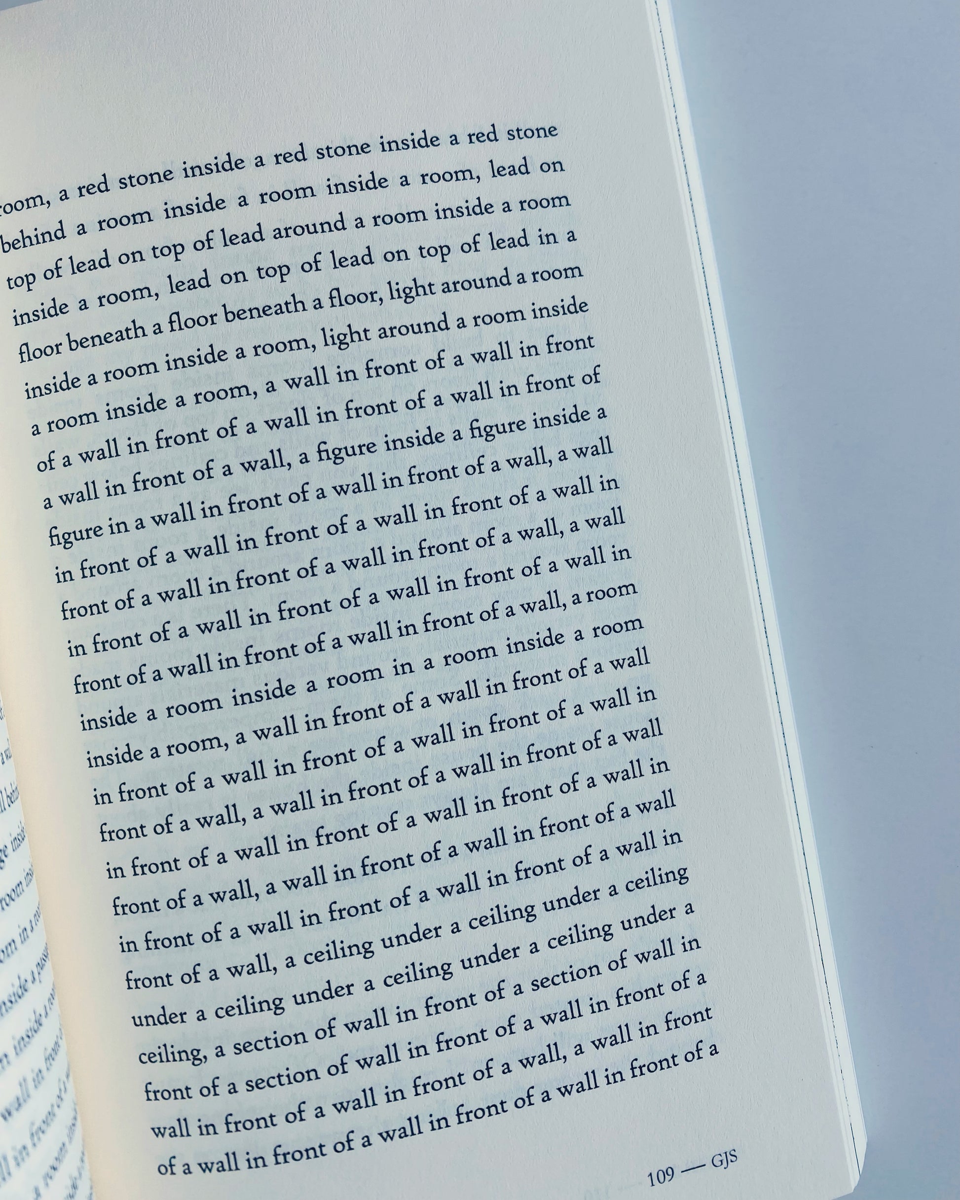 For both the conceptualist writer and practitioners of the nouveau roman, objects take on a position of prominence. For the former, words are objects. For the latter, objects come to the fore as plot and character are made subsidiary. In merging these theoretical standpoints (while also mirroring Schneider’s own artistic practice), THITHOGS places words/objects behind or in front of each other until they are no longer tools of orientation but disorientation.