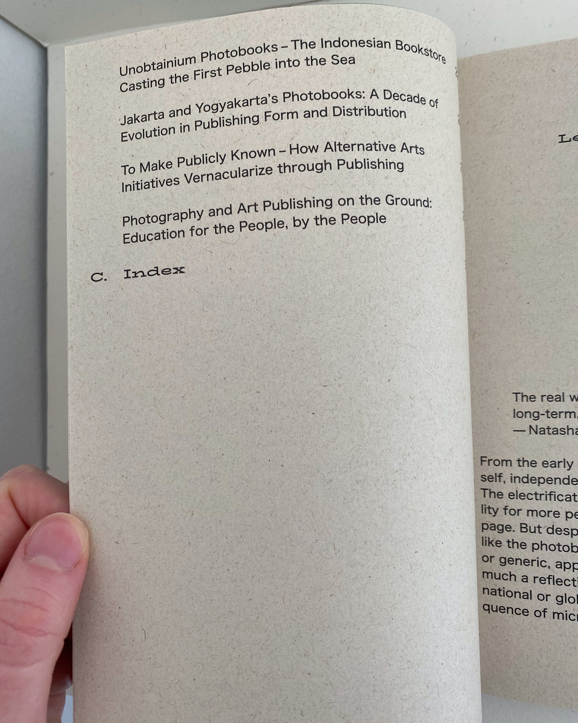 From the press: Tropical Reading: Photobook and Self-Publishing illustrates the photography practitioners and artist collectives from each city in Southeast Asia, examining why they chose to get into self-publishing. It explores how independent art bookstores came to be the social parlours of the self-publishing crowd. Furthermore, observes how the outsider artists, archives and arts initiatives of Southeast Asia came to shape the face of photography and self-publishing in their respective cities. The index is a compilation of our project field research, condensing the profiles of all the interviewees – from people to bookstores to organisations – to make a kind of alternative Yellow Pages for the Southeast Asian art scene. Colour covers supplied randomly.