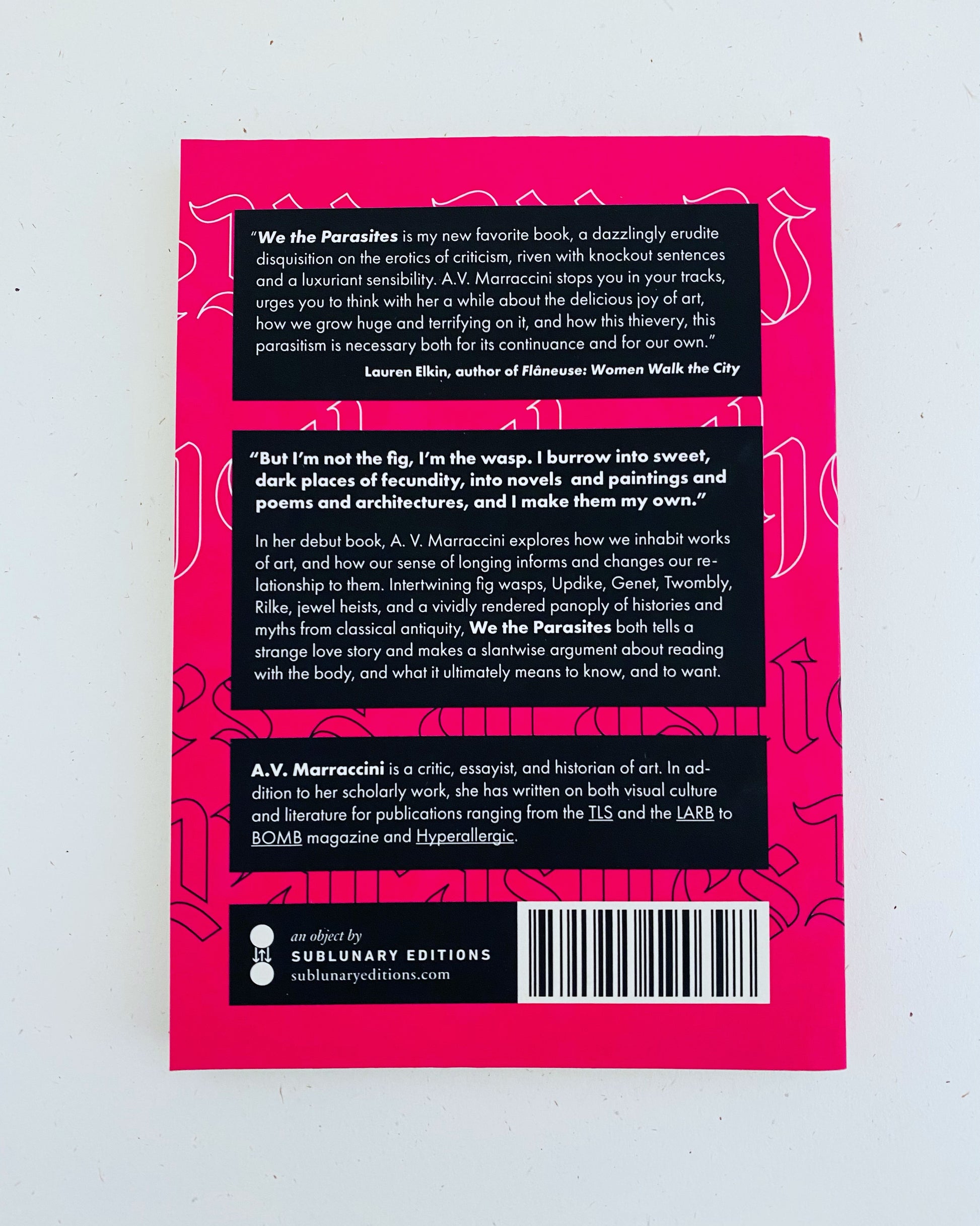 From the press: In her debut book, A. V. Marraccini explores how we inhabit works of art, and how our sense of longing informs and changes our relationship to them. Intertwining fig wasps, Updike, Genet, Twombly, Rilke, jewel heists, and a vividly rendered panoply of histories and myths from classical antiquity, We the Parasites both tells a strange love story and makes a slantwise argument about reading with the body, and what it ultimately means to know, and to want.